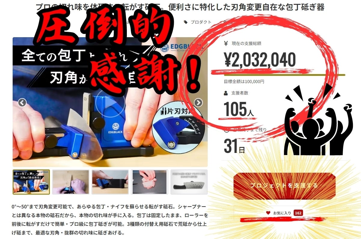 先日スタート致しました「EDGBLACK Knife Sharpener Flex」プロジェクトは、皆様からの『圧倒的な』ご支援のおかげで支援総額200万円&支援者数100名を突破することができました!