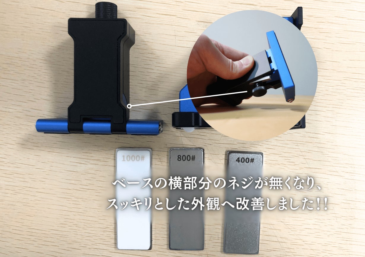 ①ベースの横に搭載されていたネジを無くし、角度調節ネジのみで角度調節が可能となりました。