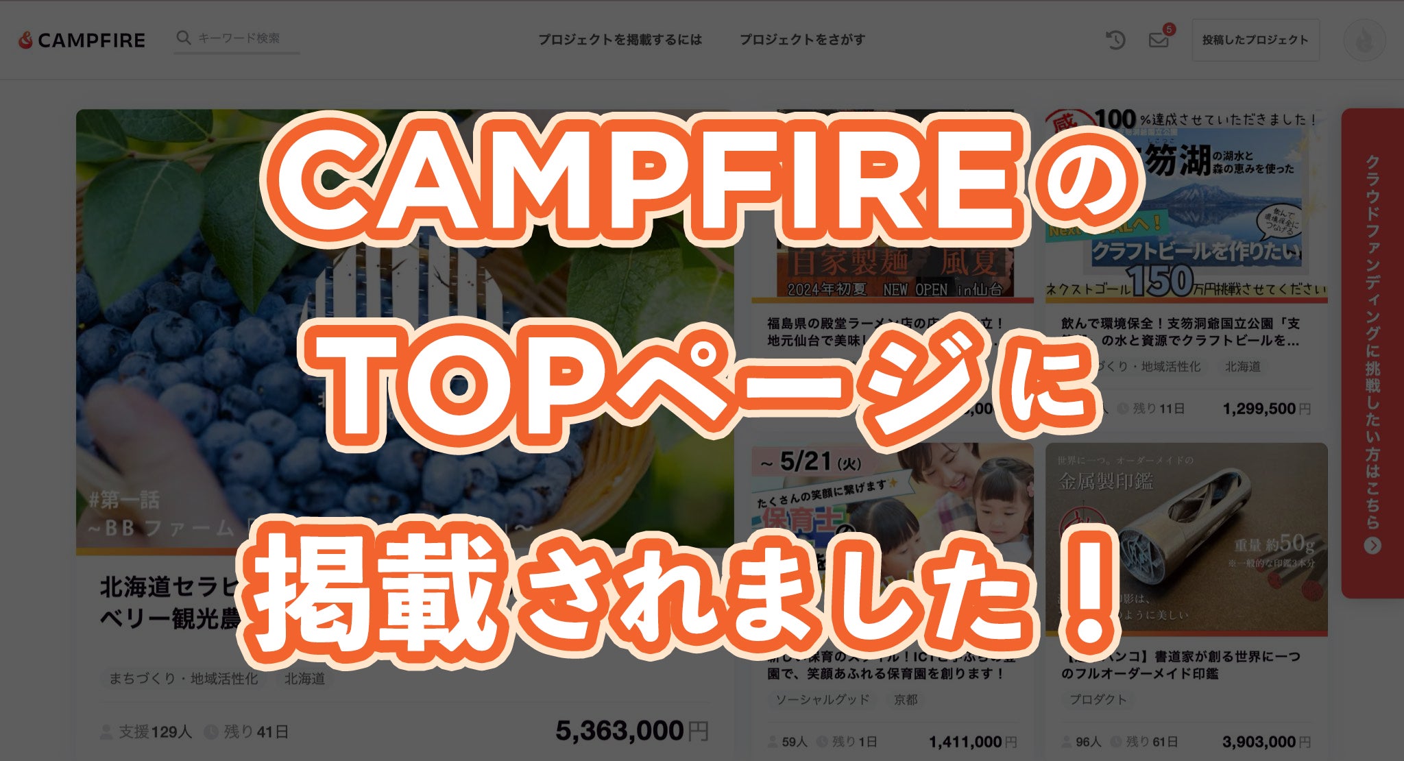 また、そんな勢いが伝わったのか、CampfireのTopページに掲載していただきました。まだまだ、金額も日数も折り返し地点ですが、多くの方にセラピータウンの魅力をお届けできるようにしていきますので、皆さまよろしくお願いいたします。