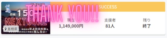2024/08/01 14:241か月間のプロジェクトが終了し、目標金額の114%を達成することができました!支援をいただいた81名のみなさん、本当にありがとうございました!!リターン品のチケットはそろそろみなさまのお手元に届いた頃でしょうか。最終日の昨日に支援をいただいた方へのお礼状は本日発送予定です。このプロジェクトを通じていただいたあたたかいコメントが私ども事務局一同、力になっております。重ねてお礼申し上げます。 松江市民のみなさんだけでなく、就職などで今は遠方にお住まいの方、観光で来ていただく方、松江にいらっしゃったことはないけれど支援をしていただいた方など、たくさんの方から愛される「松江水郷祭湖上花火大会」がこの先の未来も続いていくよう、まずは今年の開催に向けて、残り2日、一同気を引き締めて準備を進めていきたいと思います。 もっと見る
