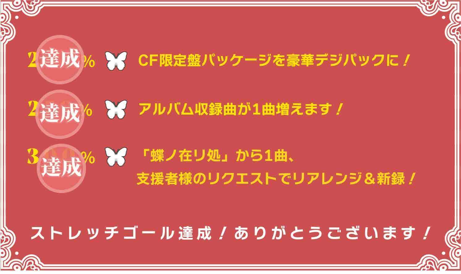 ストレッチゴール300%、達成です!参加型企画、「蝶ノ在リ処」から1曲、支援者様のリクエストでリアレンジ&新録いたします!あたたかいご支援、本当にありがとうございます!