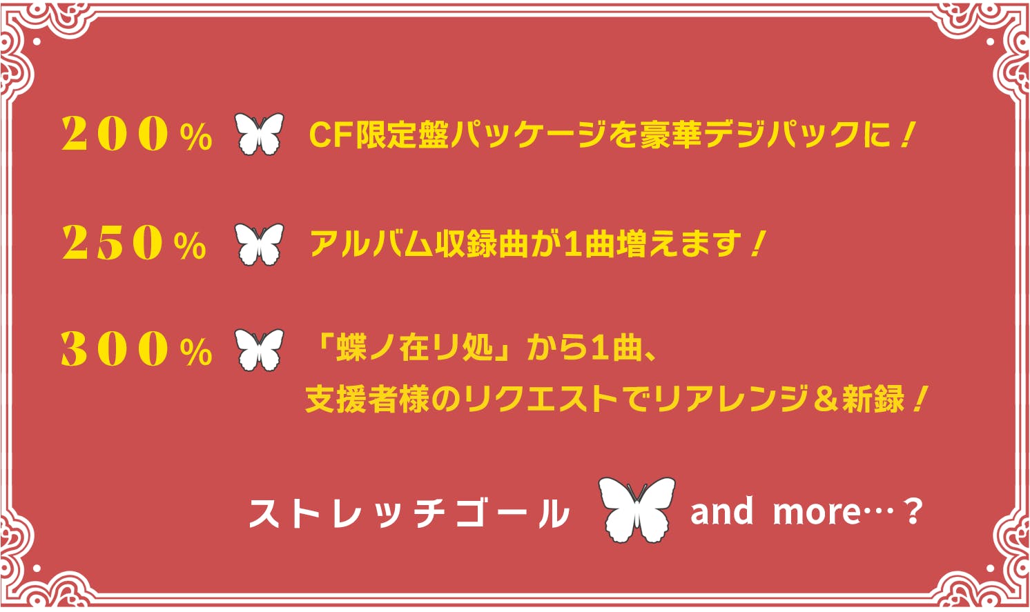 蝶シリーズ前作アルバム『蝶ノ在リ処』の楽曲を長く愛して下さっている方も今プロジェクトの支援者様には多いかと思うので(ありがとうございます)、支援者様限定でアンケートを取り、票を集めた1曲をMANYO自らリアレンジ、楽器や歌を新録して新たなバージョンでお届けします!