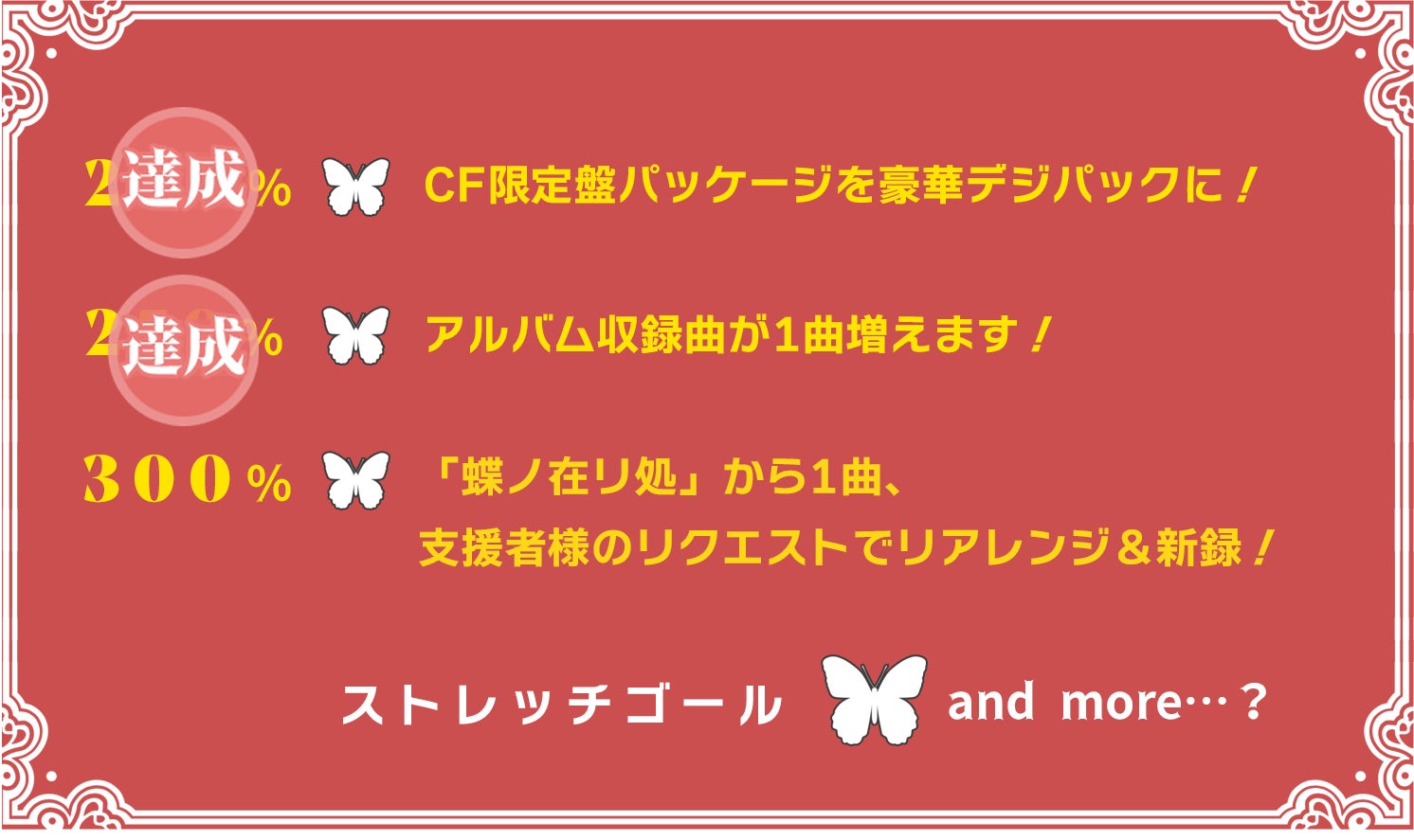 次のストレッチゴールは300%!参加型企画、アルバム「蝶ノ在リ処」から1曲、支援者様のリクエストでリアレンジ&新録いたします!CF募集終了しましたら支援者様限定でアンケートにご参加いただき、得票数の多い楽曲を1曲、MANYOさん自らリアレンジ予定です。こういう機会でもないとなかなか出来ない参加型お祭り企画、是非達成に向けてプロジェクトの情報拡散、ご支援、引き続き宜しくお願いいたします!