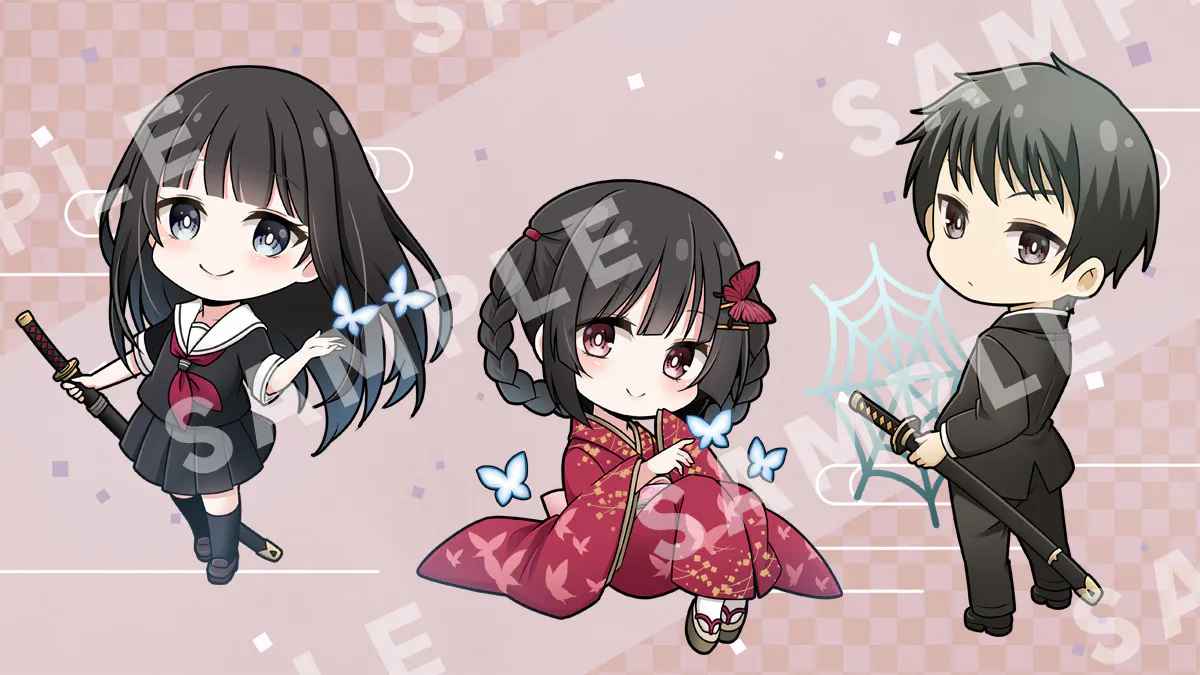 こちらは亭午(ていご)の遊宴コースと、永久(とこしえ)の饗宴コース以上のコースに含まれるリターン品『蝶ノ在リ処』ミニキャラアクリルスタンドのイラストです!めちゃめちゃ可愛いイラストは門瀬粗さんに描いていただいております!!飾ったり、一緒に鞄に付けたりした~い。すごろくのコマとしても早く遊びたいですね…!『蛍灯ノ涯』キャラもとっても楽しみです。