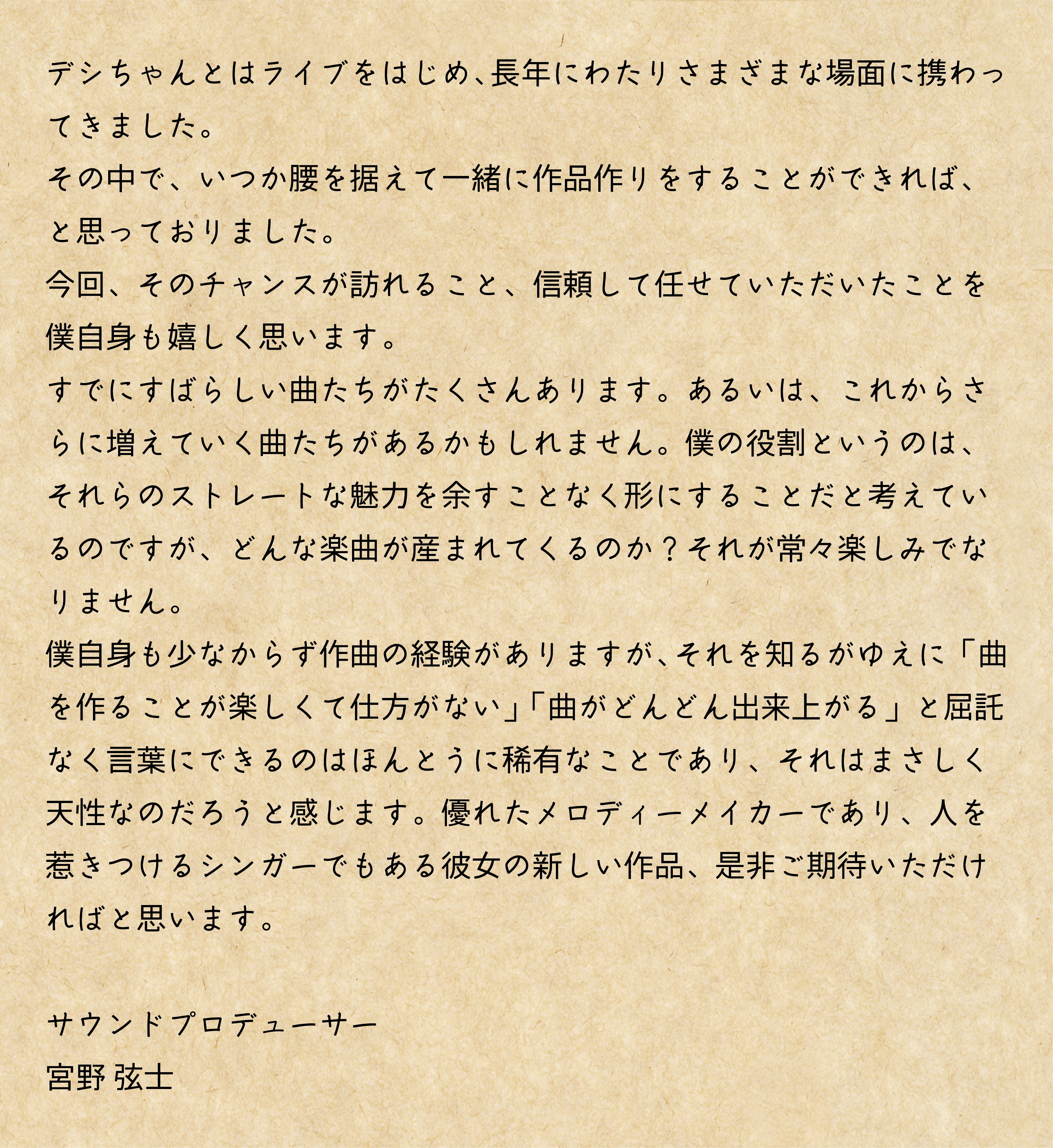 今までCDをあまり買ったことがない方もいると思いますが、そんな方にもCDのうれしさ、歌詞カードを開く時のワクワクを感じてもらいたいです。私自身、好きな曲が入っているCDは人いちばん宝物に感じるので、みなさまにもそんな風に思っていただけるような音楽をつくりたいと思っています。