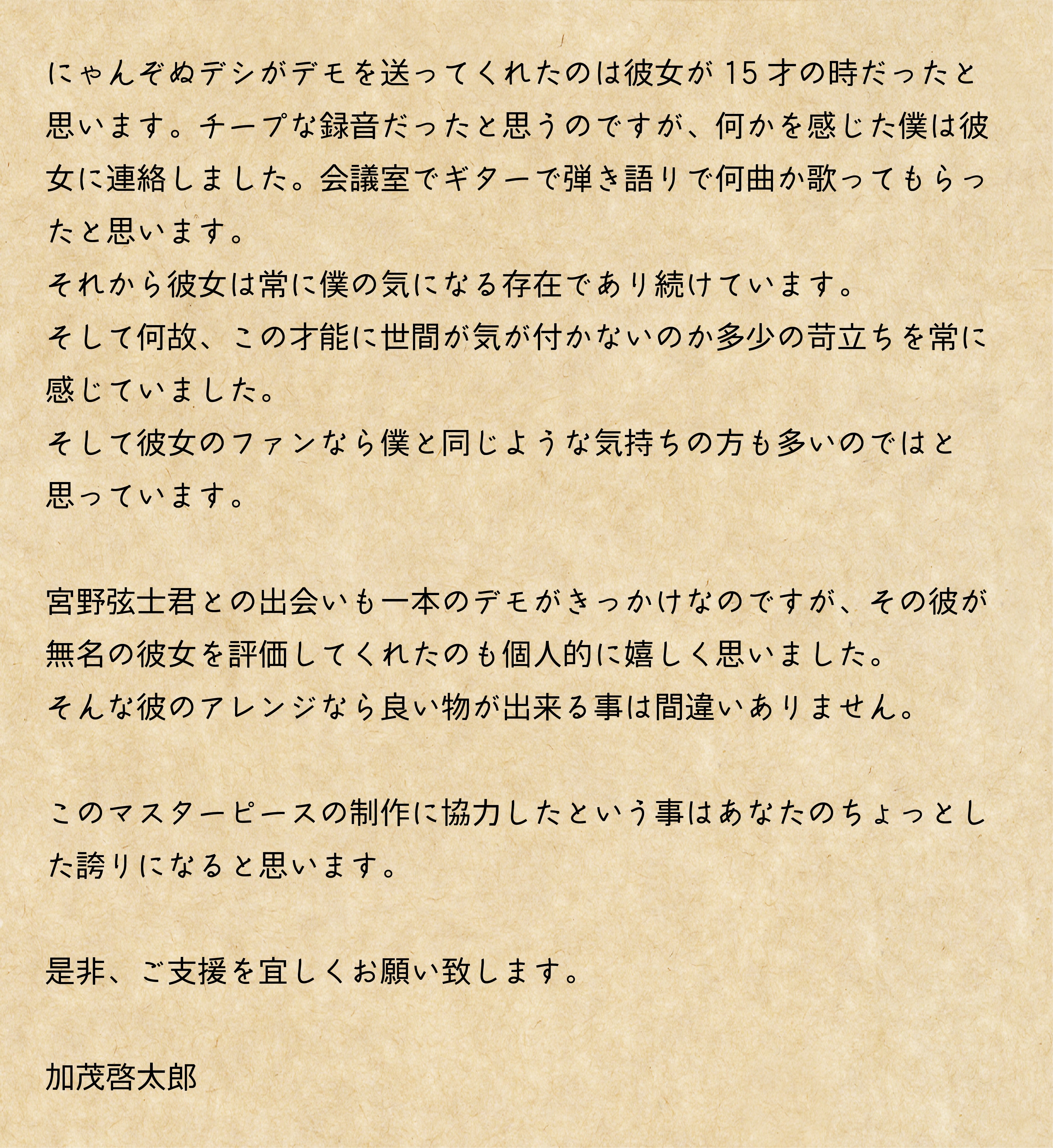 にゃんぞぬデシの音楽を100%ストレートに伝えるためには、宮野弦士さんの協力が不可欠であると感じ、このプロジェクトをスタートさせました。