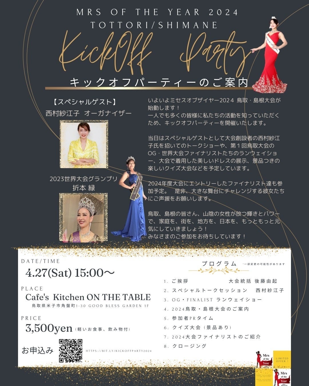 ミセスオブザイヤー2024キックオフパーティーに参加してきました!志同じく、美を追求しチャレンジする美しいコンテスタントの方々に、山陰でもお会い出来るなんて(#´ᗜ`#)本当に嬉しかったです!! 皆さんも、自分自身を磨くためだけでなく、やはり地元のため、応援してくれる人のために頑張りたいという強い思いを持っておられることが分かりました。世界大会OGの方からは、ドレスのアドバイスやマインドコントロールなども教えていただき、刺激いっぱいの充実した1日になりした!!ミセスオブザイヤー関係者の皆様、本日はご招待いただき、誠にありがとうございました。大会のご成功を心よりお祈り申し上げます✿