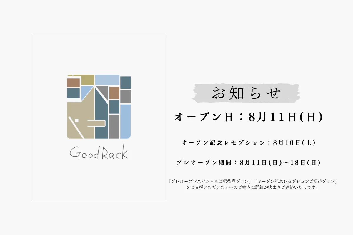 皆さまからの熱い応援にお応えできるように、GoodRackは8月11日(日)のオープンに向けて鋭意準備中です。クラファンはGoodRackにとってはじまりの1歩にすぎません。皆さんの応援の気持ちにお応えできるようにお店を作っていくことを最後まで諦めずにやり遂げます!