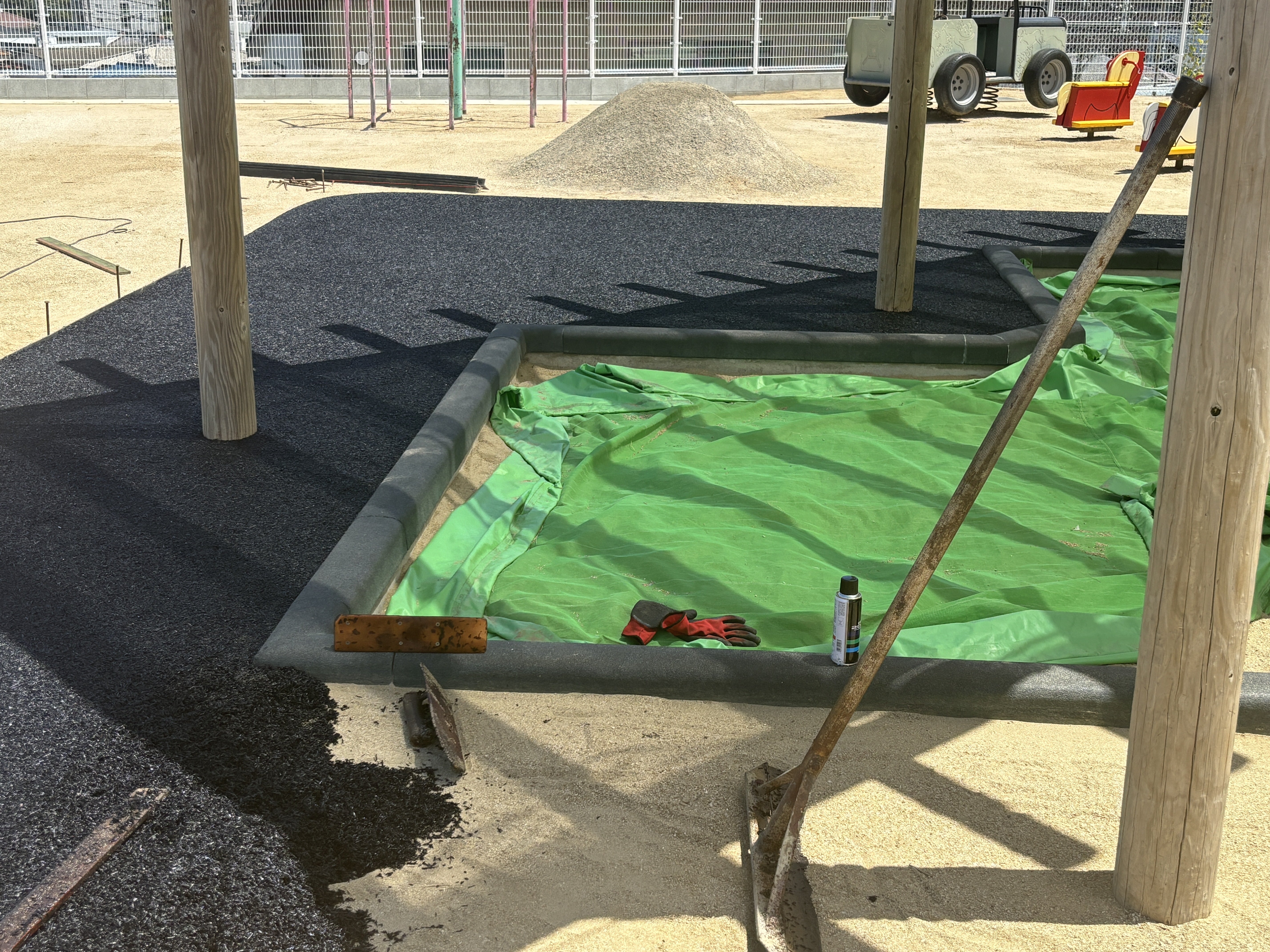 砂場のまわりにゴムチップが付きました。これから滑り台の下にもゴムチップが付きます。