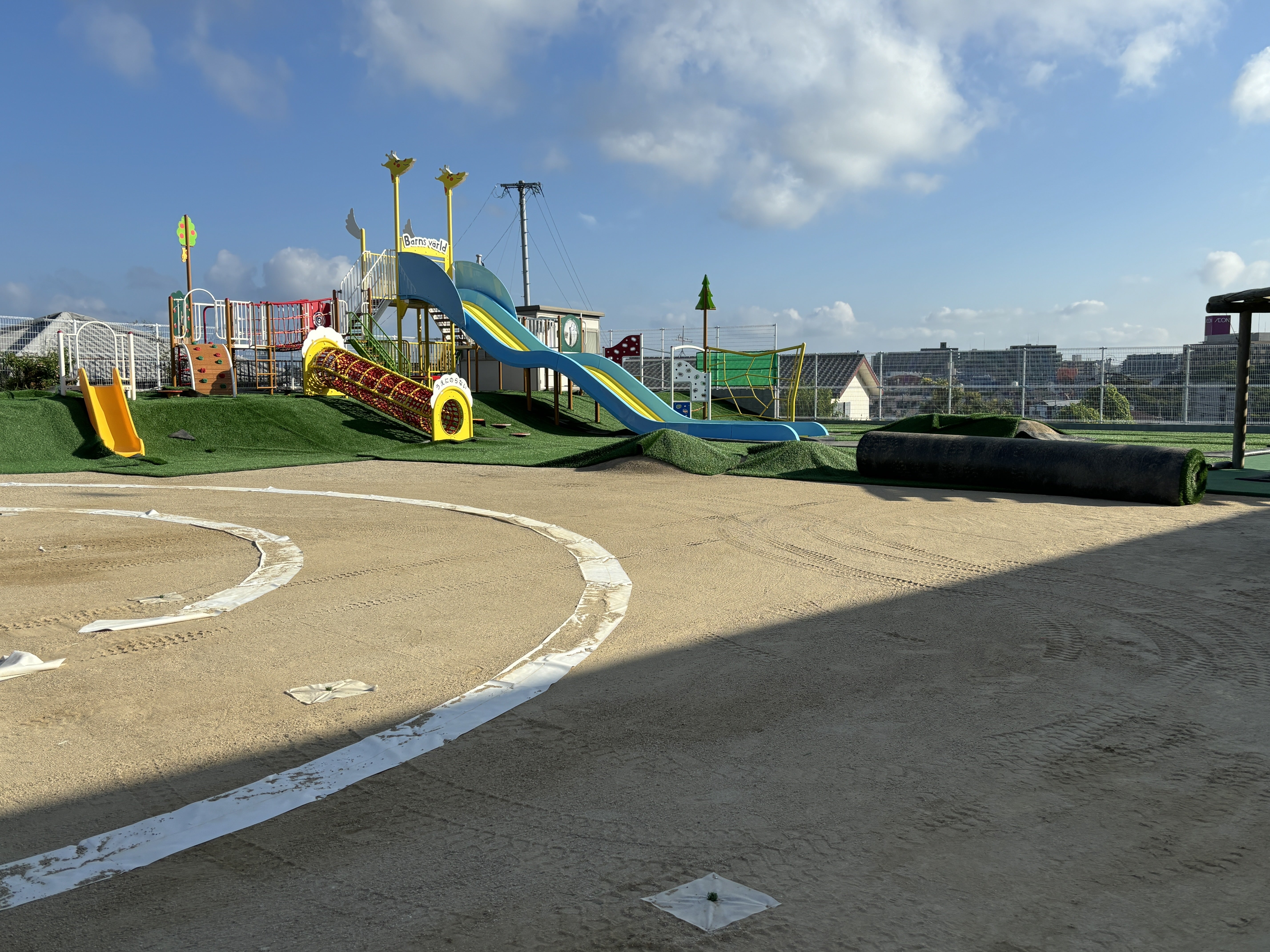 遊具の下に人工芝が入りました。白い部分はトラックラインとマーチングのポイントになります。