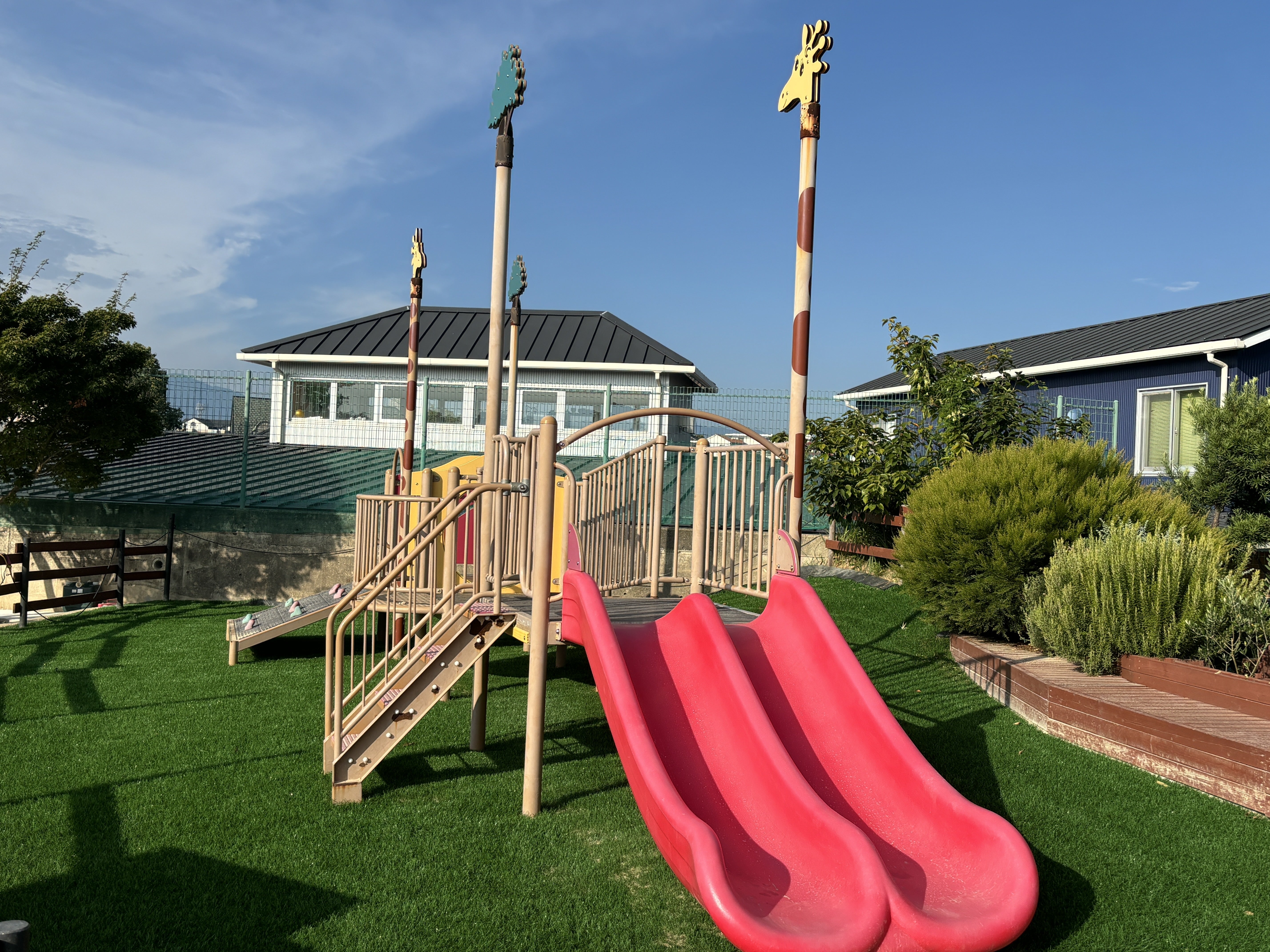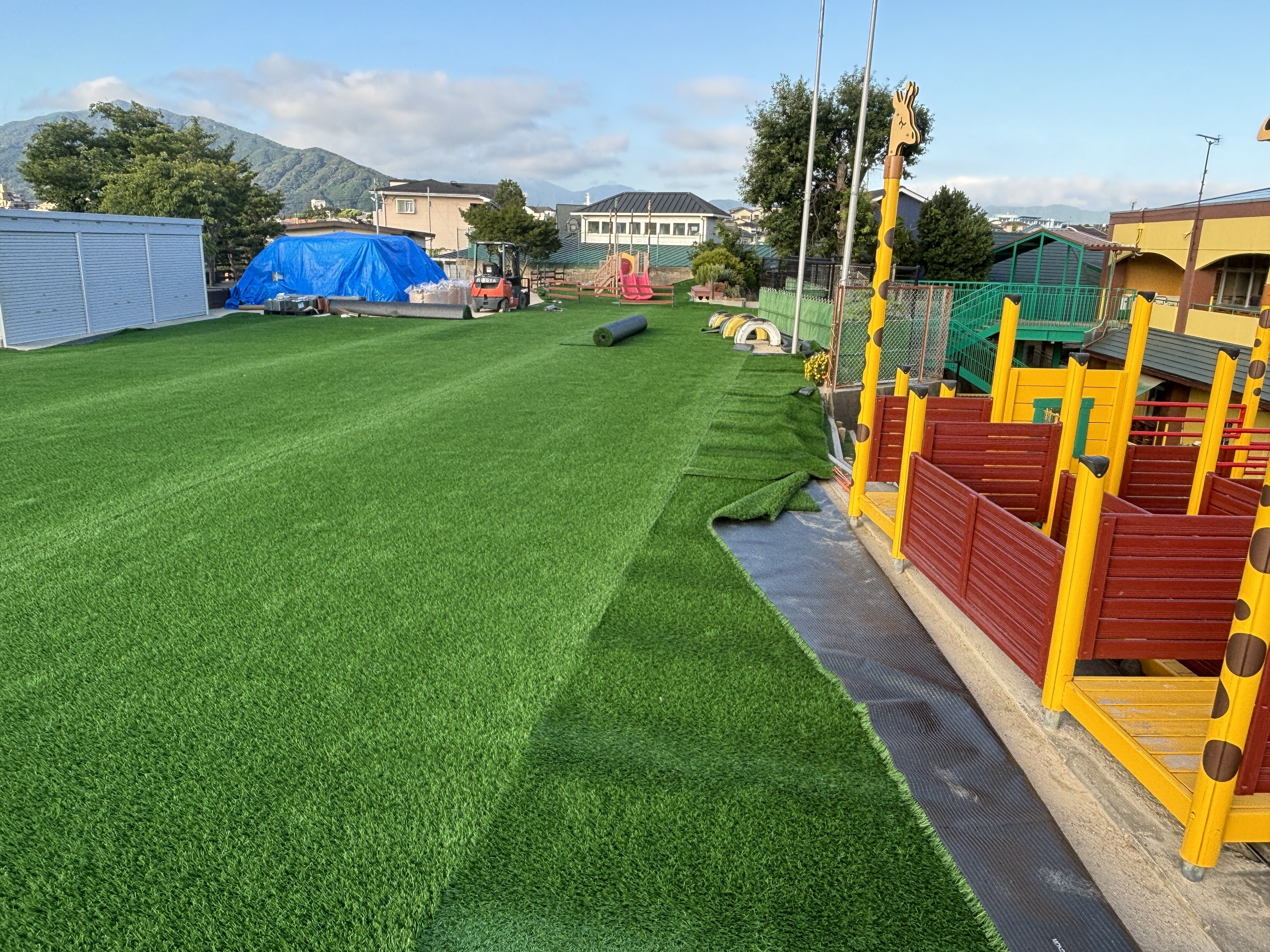 未満児さんが遊ぶ遊具の下に人工芝が入りました。これで転んでも大丈夫です。