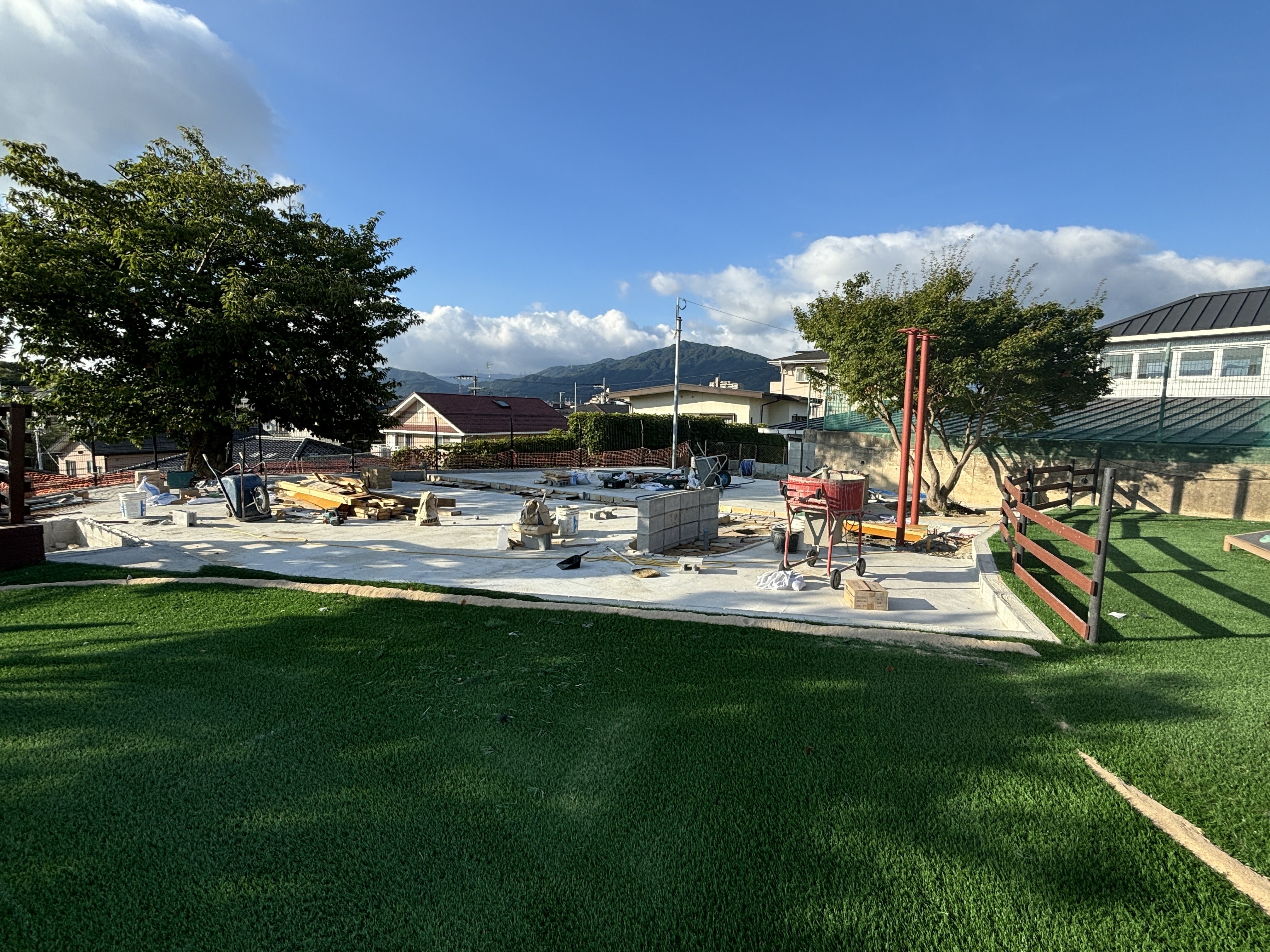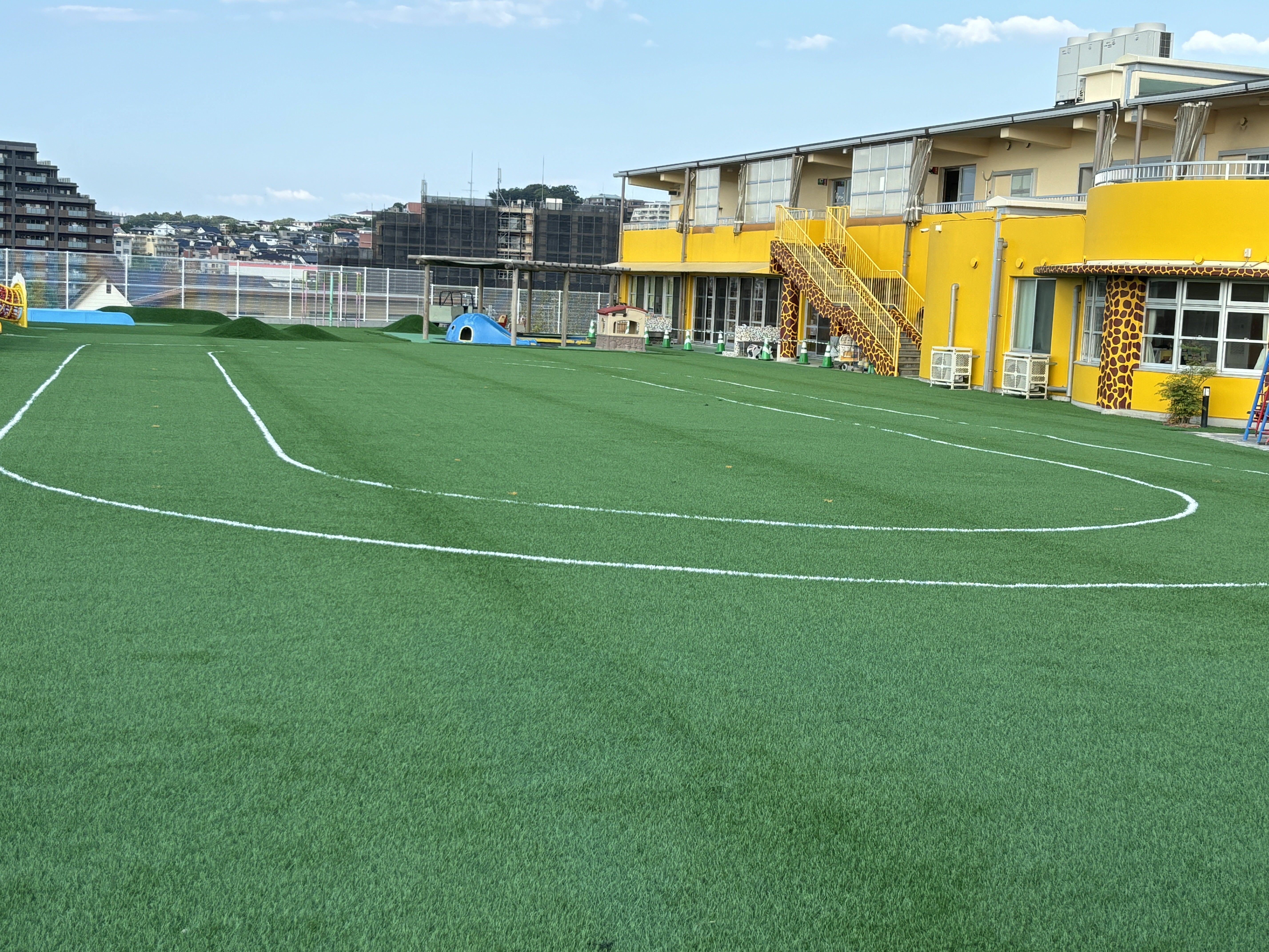 上園庭の人工芝にトラックとマーチングポイントが入り完成が近づいてきました。