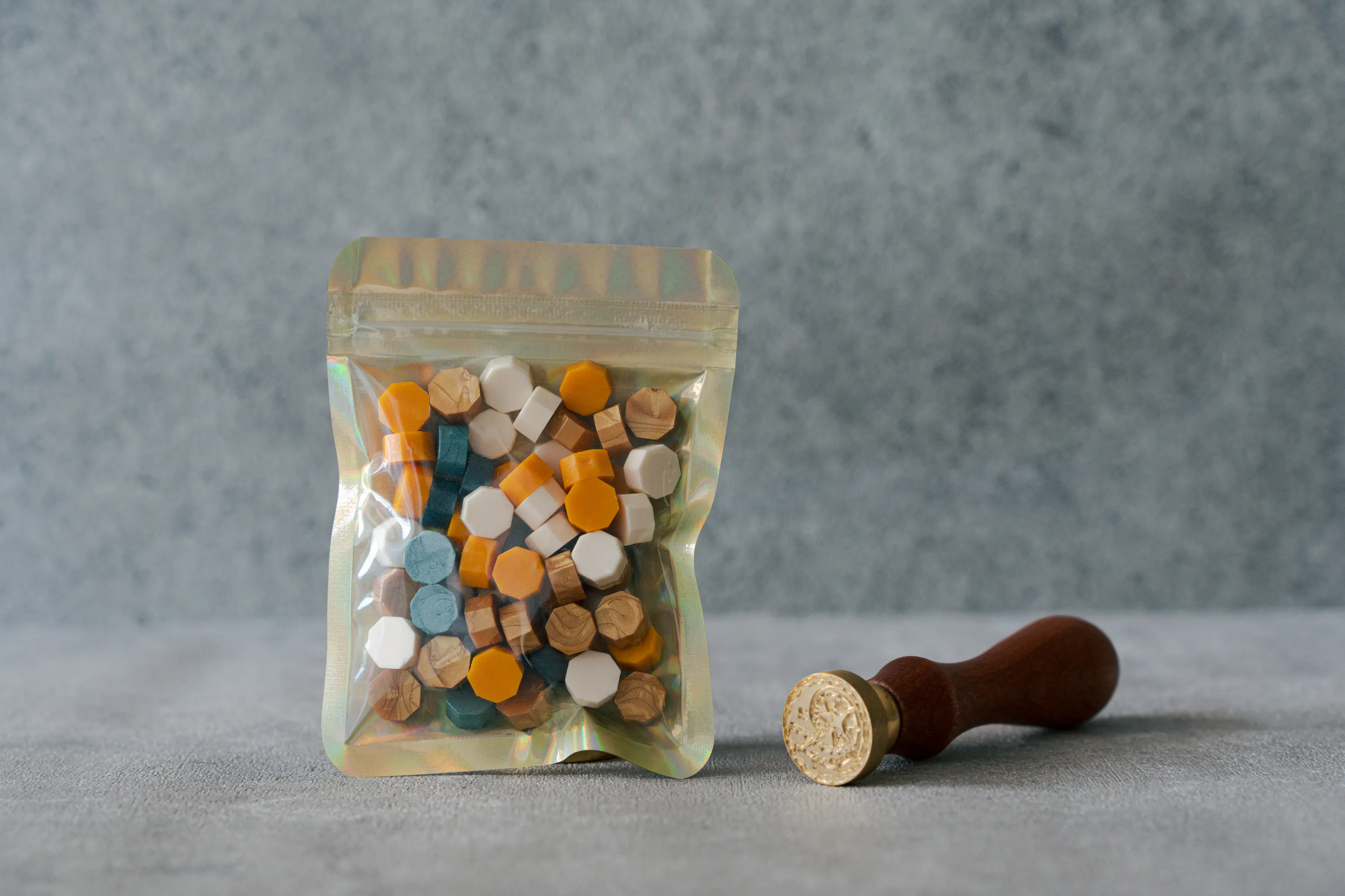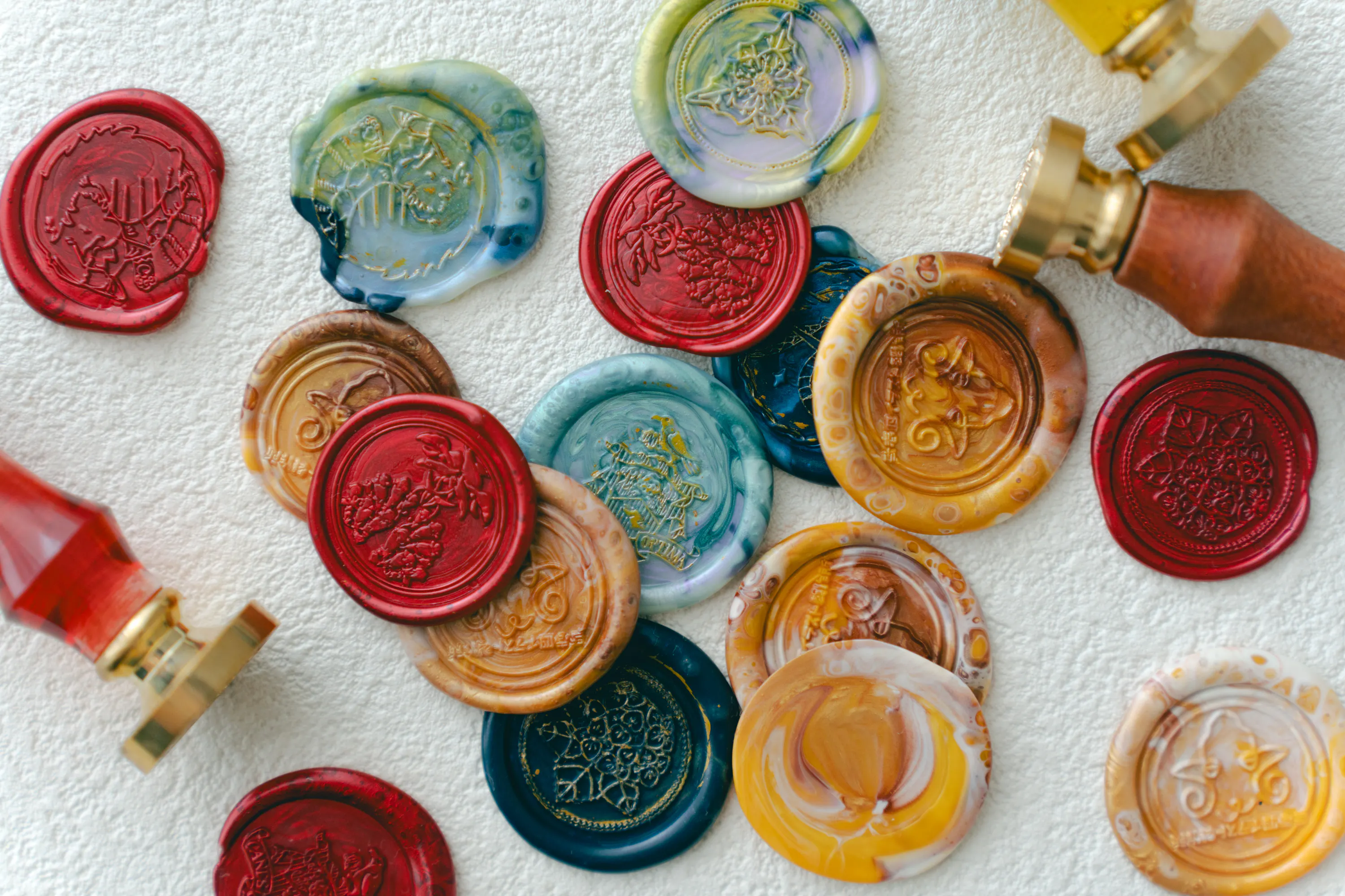 シーリングスタンプは直径25mmと20mmの2種類からお選びください。シーリングワックスは、100色以上からランダムで4種類お付けします。
