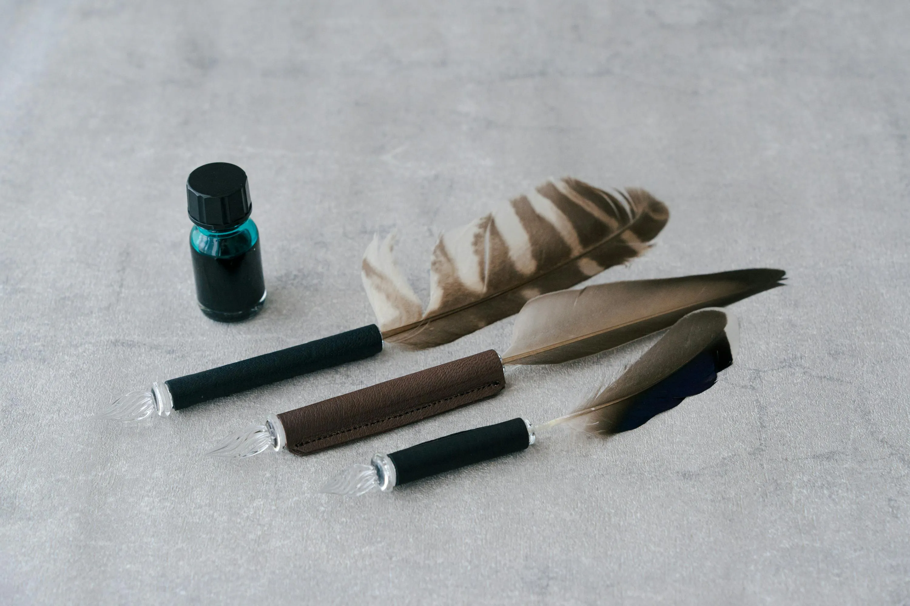 エモい手紙はぜひ、エモいペンとインクで書いてほしい!羽根ガラスペンとインクのセットはいかがでしょうか?伝右衛門製作所様、クラルト様、川崎文具店様、3つのお店のコラボレーションで、このセットが実現しました。