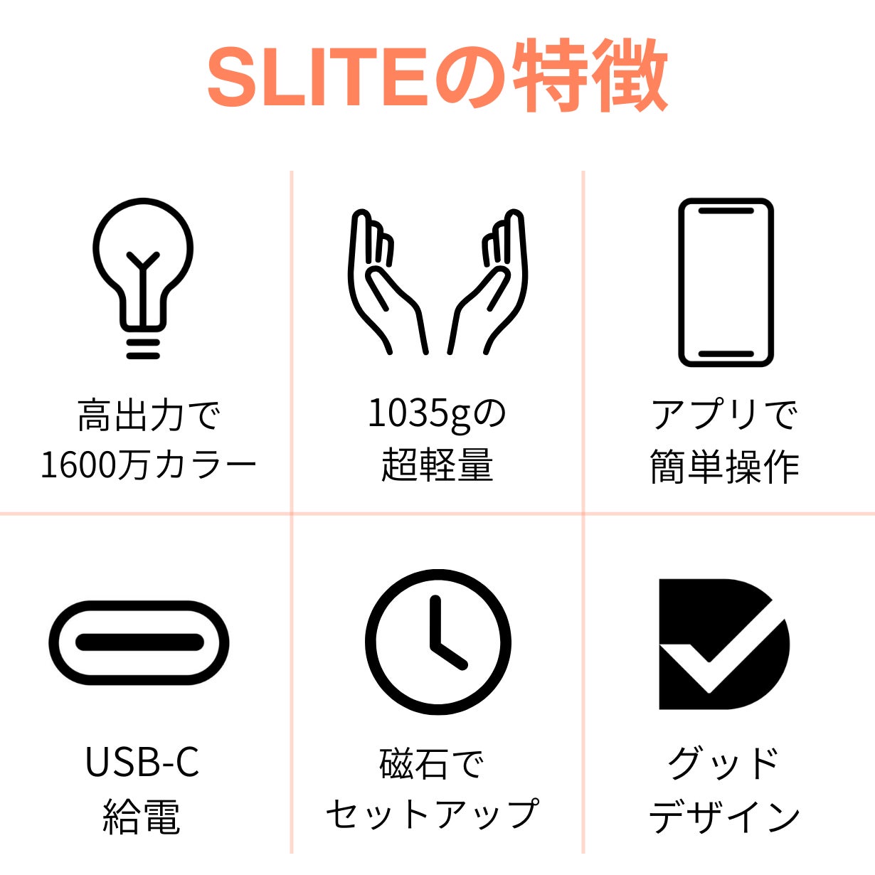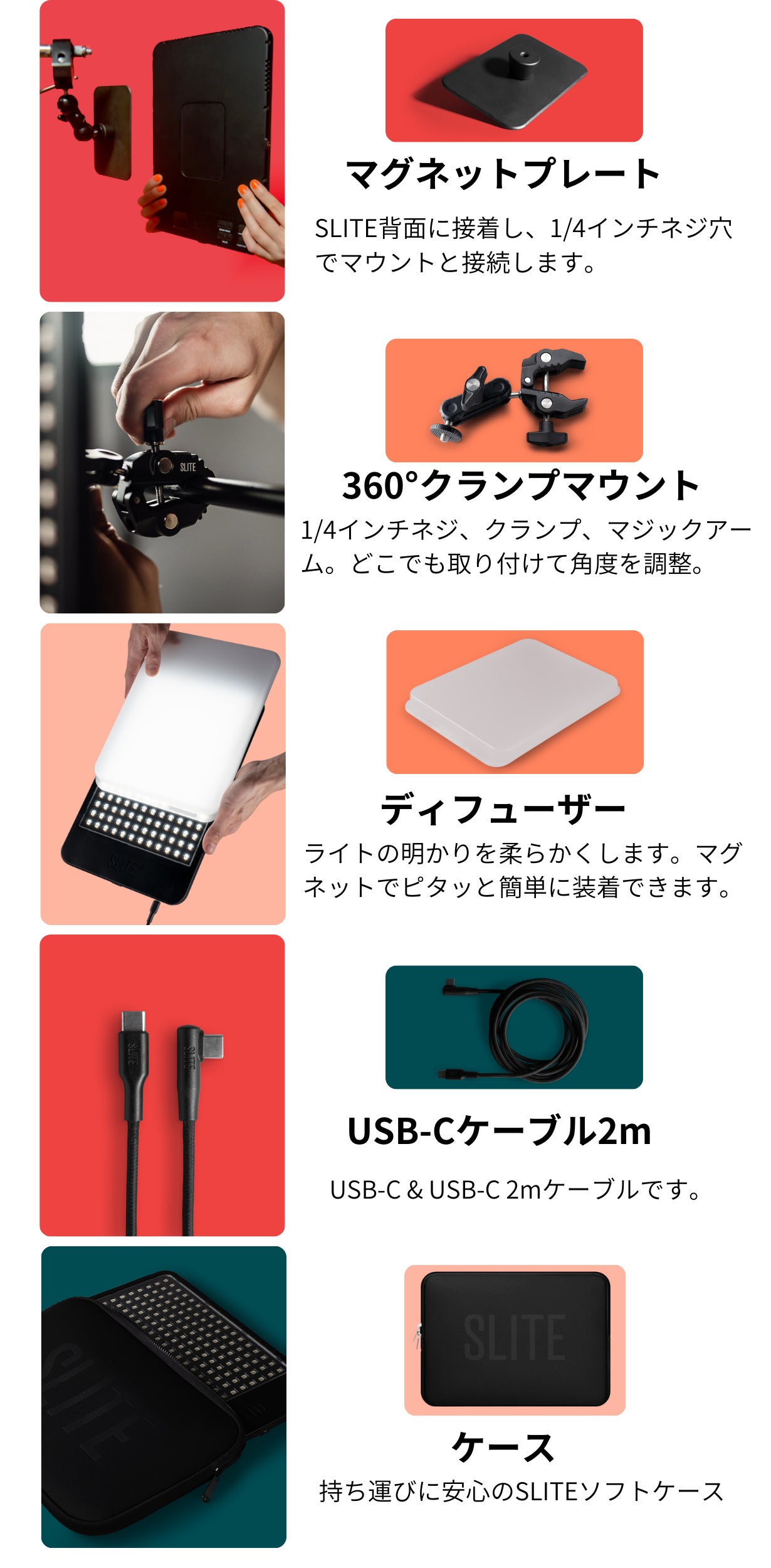 これまでの照明は専用バッテリーを充電して本体に装着が多かったのですが、SLITEはUSB-C給電です。
