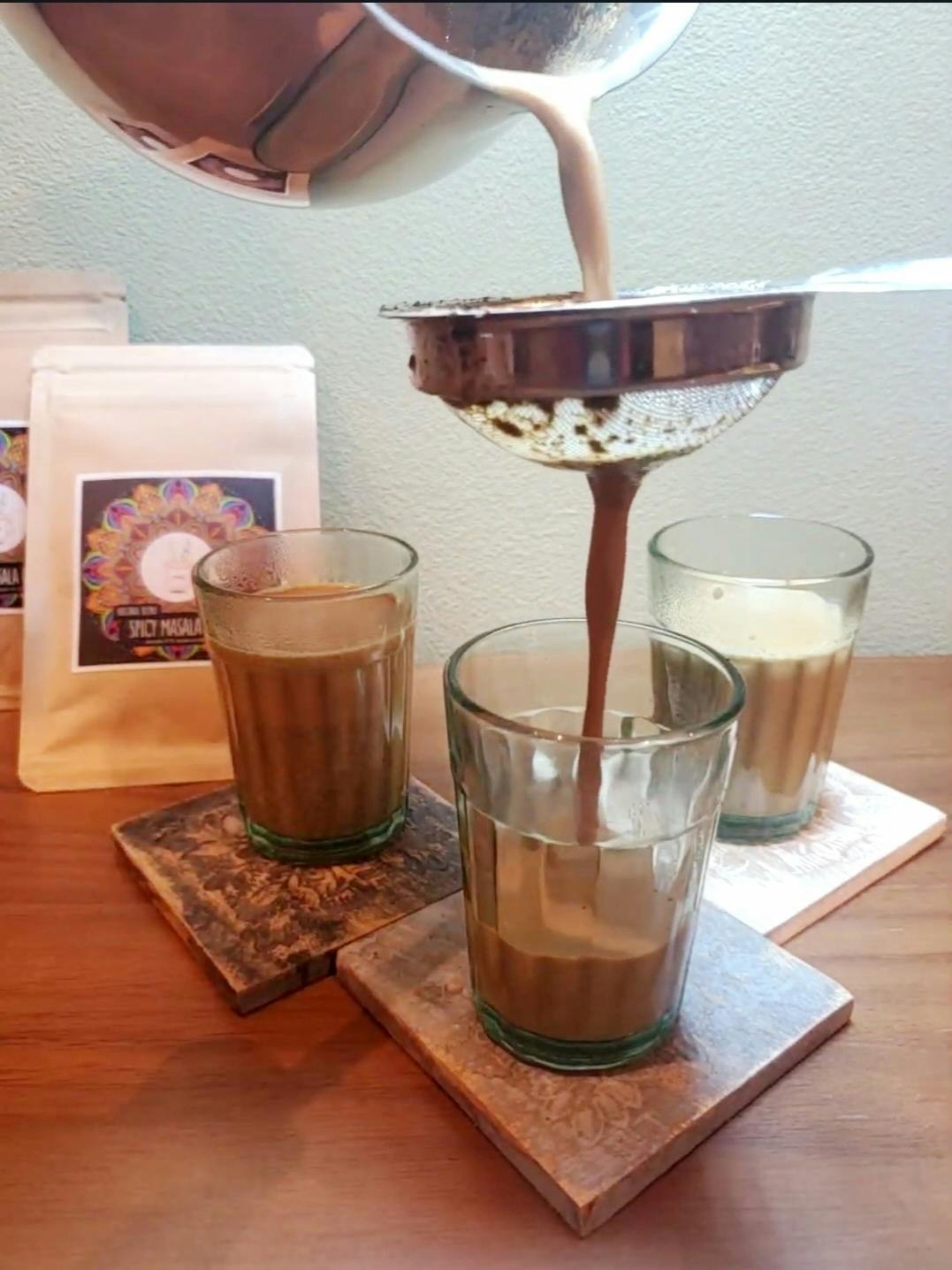 紅茶の茶葉をミルクとお湯で煮出し、いくつかのスパイスと砂糖を加えて作られます。