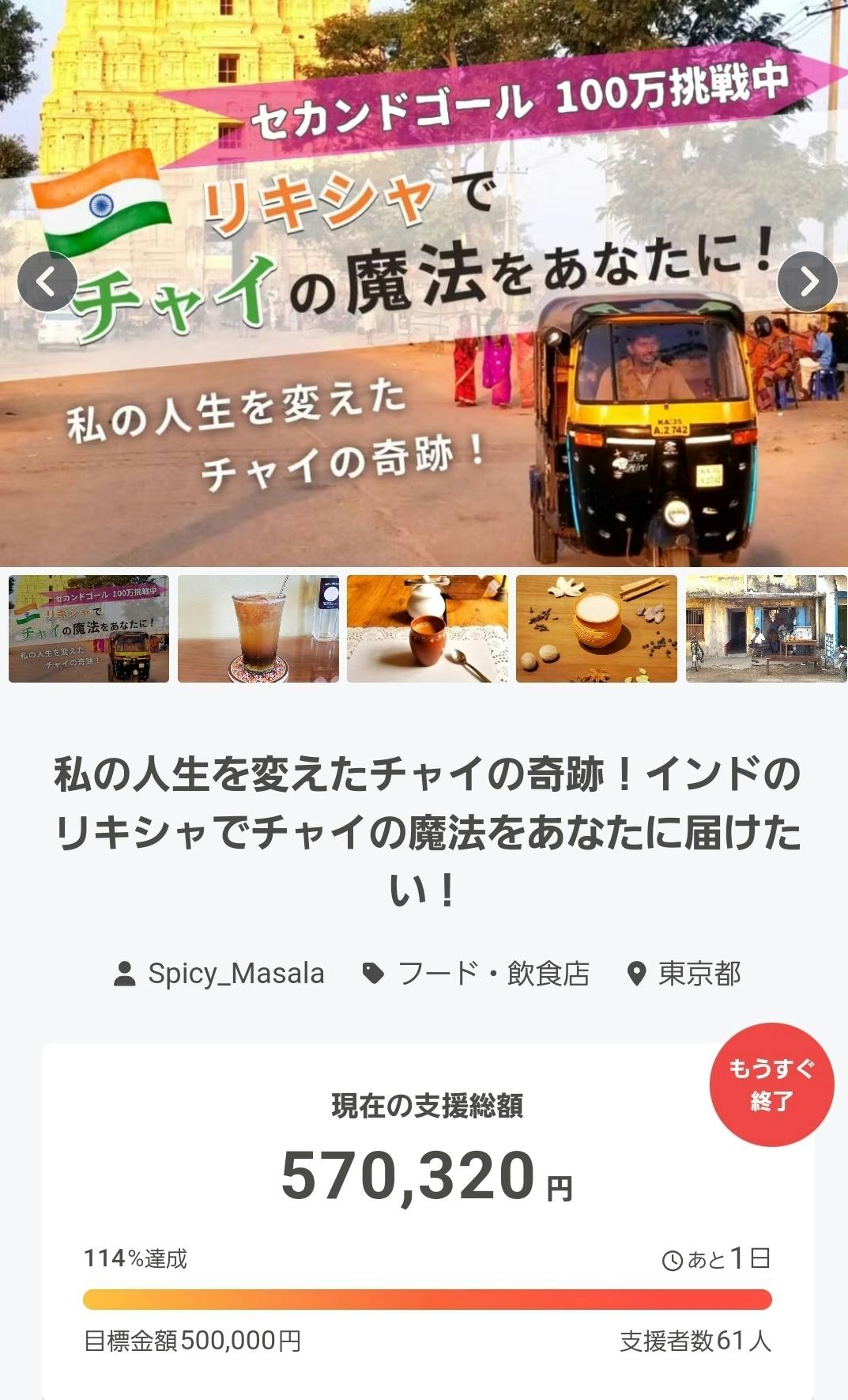 10/30から挑戦していますクラウドファンディングも残り1週間となりました。公開前からトラブルに見舞われながらも、試行錯誤しながら何とか第一目標は達成することが出来ました。ご支援頂けた方、本当にありがとうございます。達成後はセカンドゴール100万円に挑戦しています。が、実はリキシャの購入には200万円かかります。正直、手数料やリターンなどで、ご支援していただいた金額はほぼ無くなってしまいます。クラファンに挑戦した本当の理由は、資金集めではなく、たくさんの方に知ってもらう事です。残り1週間、更なる拡散のため、皆様のお力をお貸しください。最後のラストスパートのご協力、よろしくお願いいたします。Spicy.Masala店主kenji