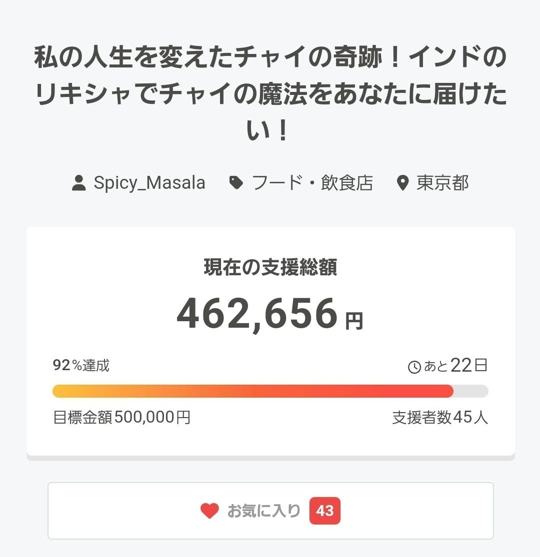 こんにちわ。プロジェクト公開から20日が経過しました。11/19am10:00現在で第一目標達成率が72%となりました。皆様のご支援、ご協力のおかけでコツコツとご支援者が増えております。ありがとうございます。残り36日です。12月25日には最終目標達成に向けて更なる拡散のご協力よろしくお願いいたします。クラファン挑戦中!←リールを作りましたので拡散のご協力よろしくお願いいたします。また、フライヤーの配布などご協力頂けますと助かります。よろしくお願いいたします。Spicy.Masala店主kenji