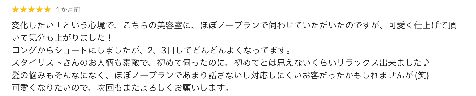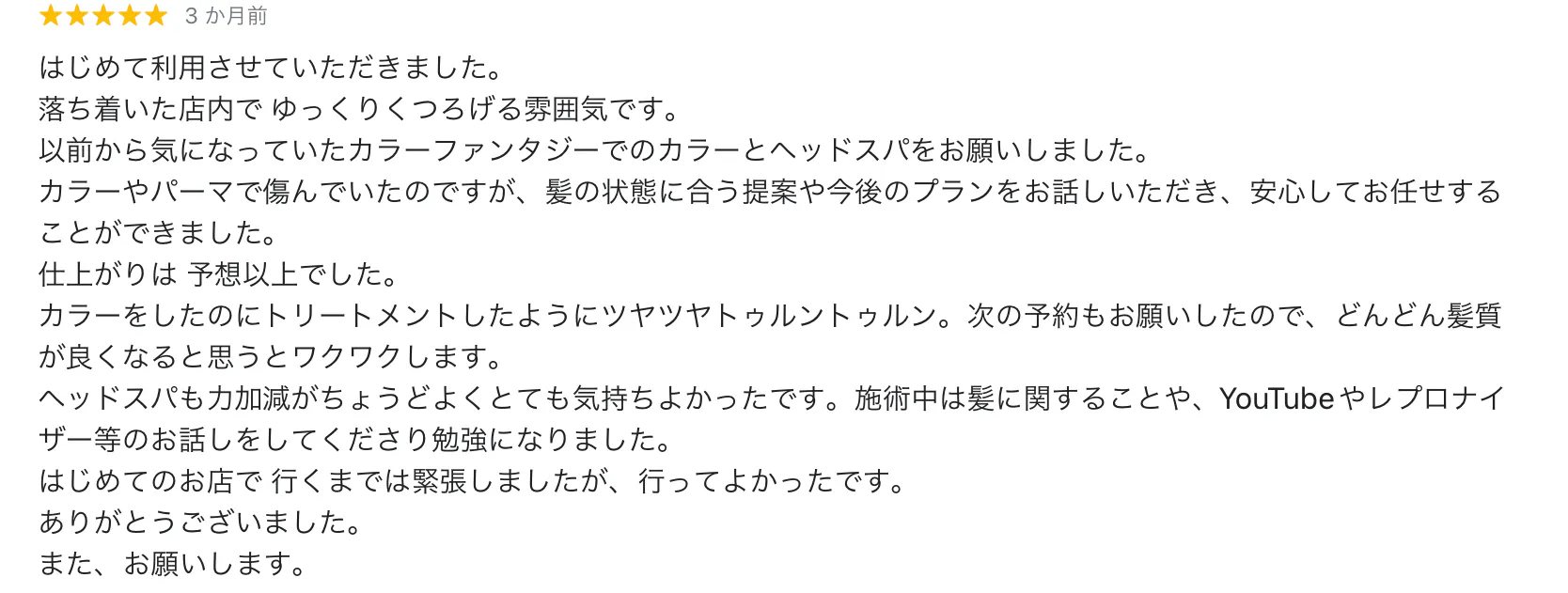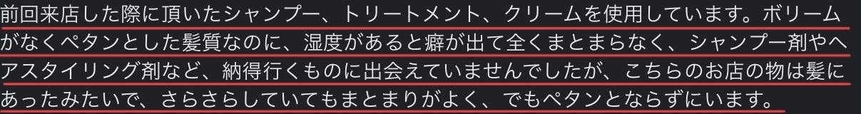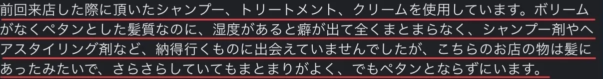 前回来店した際にいただいたシャンプー、トリートメント、クリームを使用しています。ボリームがなくペタンとした髪質なのに、湿度があると癖が出て全くまとまらなく、シャンプー剤やヘアケア剤など、納得行くものに出会えていませんでしたが、こちらのお店の物は髪にあったみたいで、さらさらしていてまとまりがよく、でもぺたんとならずにいます。