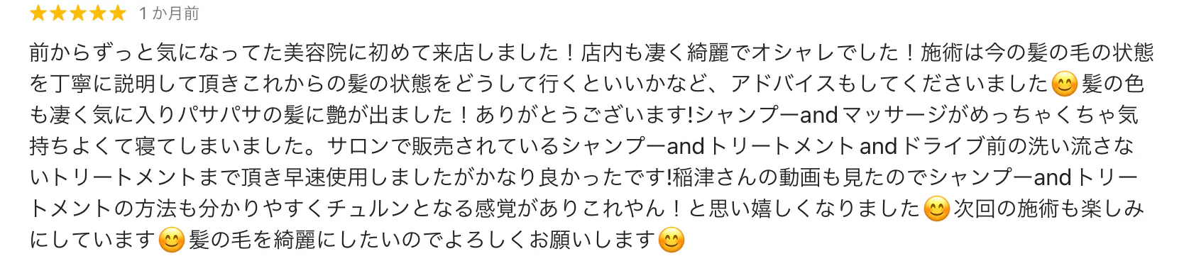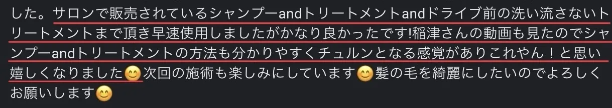 サロンで販売されているシャンプーandトリートメントandドライヤー前への洗い成さないトリートメントまで頂き早速使用しましたが、かなり良かったです!稲津さんの動画も見たのでシャンプーandトリートメントの方法も分かりやすくチュルンとなる感覚がありこれやん!と思い嬉しくなりました😊