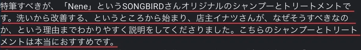 特筆すべきが、『Nene』というSONGBIRDさんのオリジナルのシャンプーとトリートメントです。洗いから改善する、というところから始まり、店主イナツさんが、なぜそうすべきなのか、という理由まで分かりやすく説明をしてくださりました。こちらのシャンプーとトリートメントは本当におすすめです。