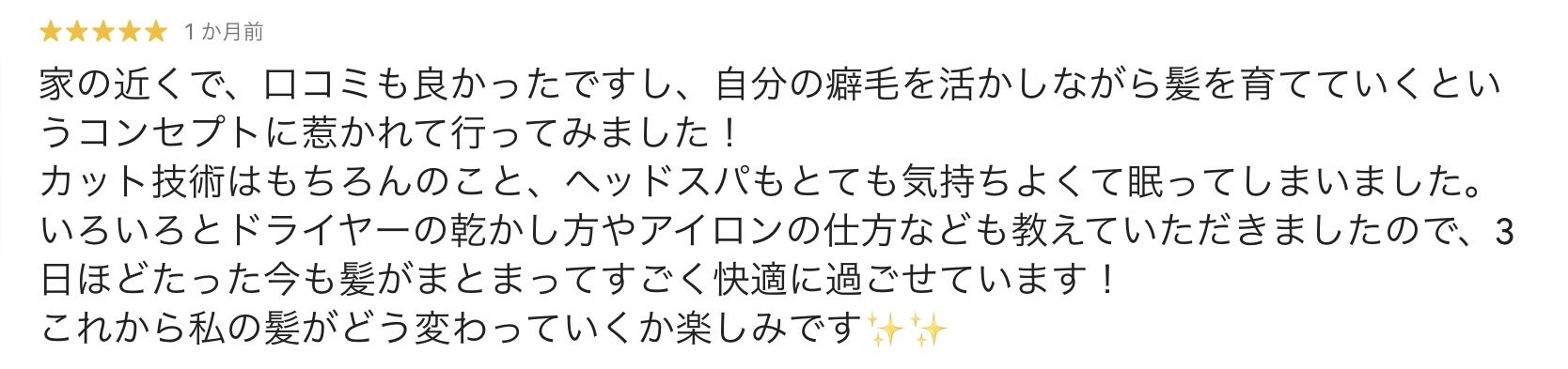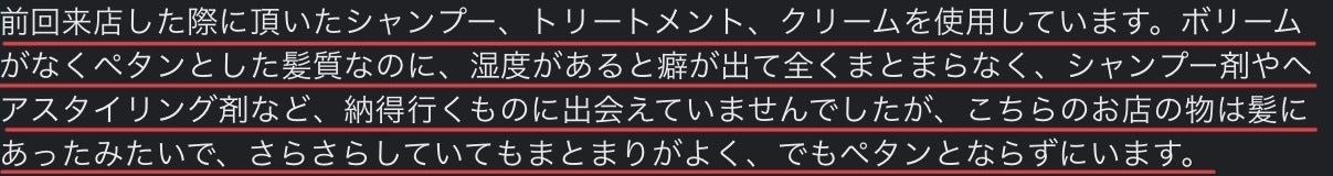 前回来店した際にいただいたシャンプー、トリートメント、クリームを使用しています。ボリームがなくペタンとした髪質なのに、湿度があると癖が出て全くまとまらなく、シャンプー剤やヘアケア剤など、納得行くものに出会えていませんでしたが、こちらのお店の物は髪にあったみたいで、さらさらしていてまとまりがよく、でもぺたんとならずにいます。