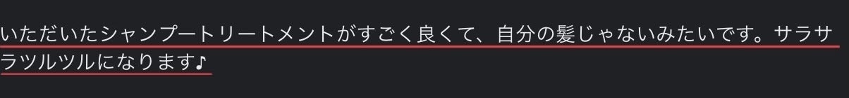 いただいたシャンプートリートメントがすごく良くて、自分の神じゃないみたいです。サラサラツルツルになります♪