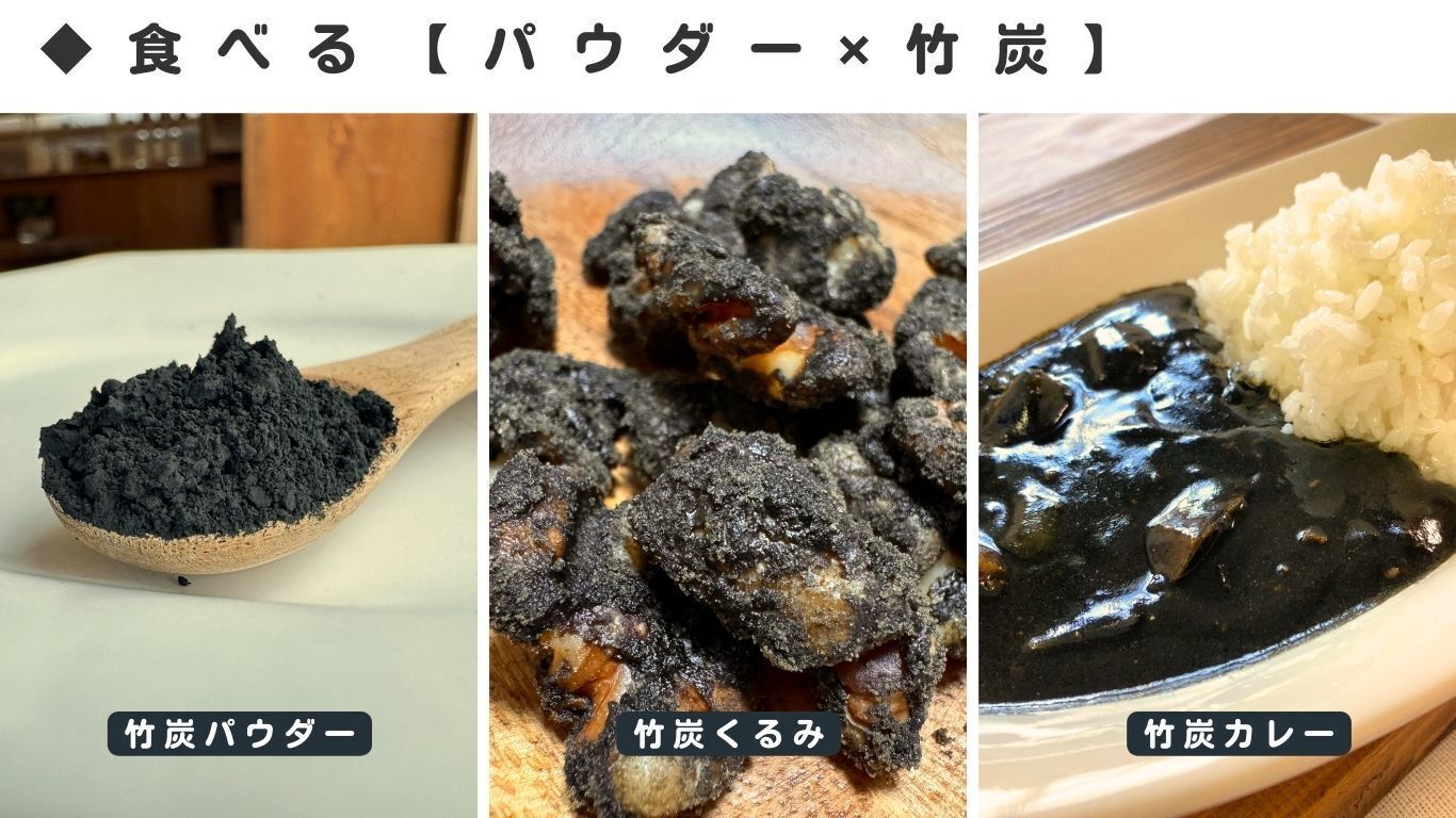 朝のコーヒーにポンっと入れて混ぜるだけで、気軽に楽しめます。料理をする方は、イカスミパスタならぬ竹炭パスタ、カレーに入れてブラックカレー! 竹炭色のパンやケーキを焼いたり。飲み物やお料理に混ぜるだけでOKです。