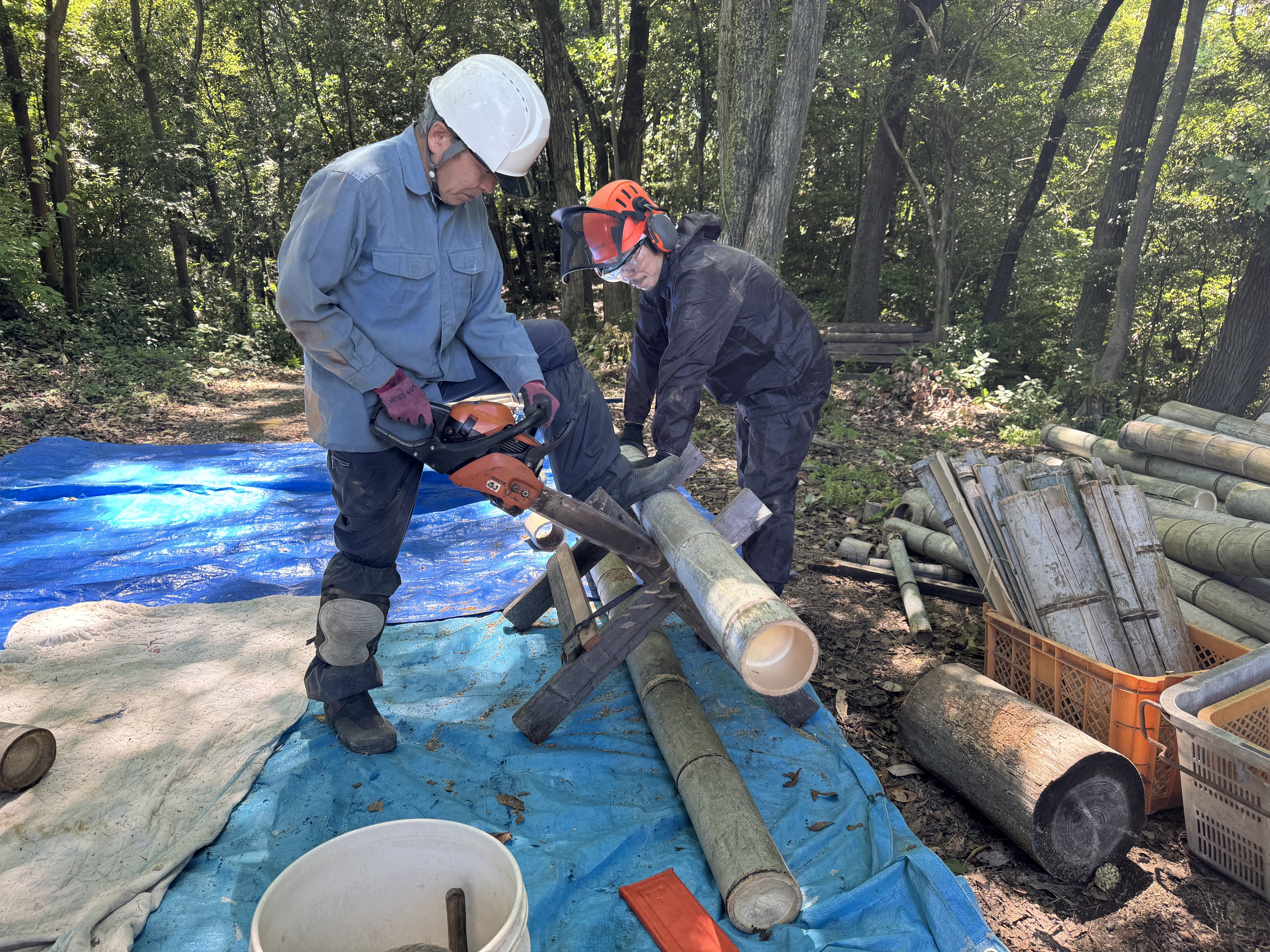 竹を伐採した後に、1本1本チェーンソーで短くカットしていきます