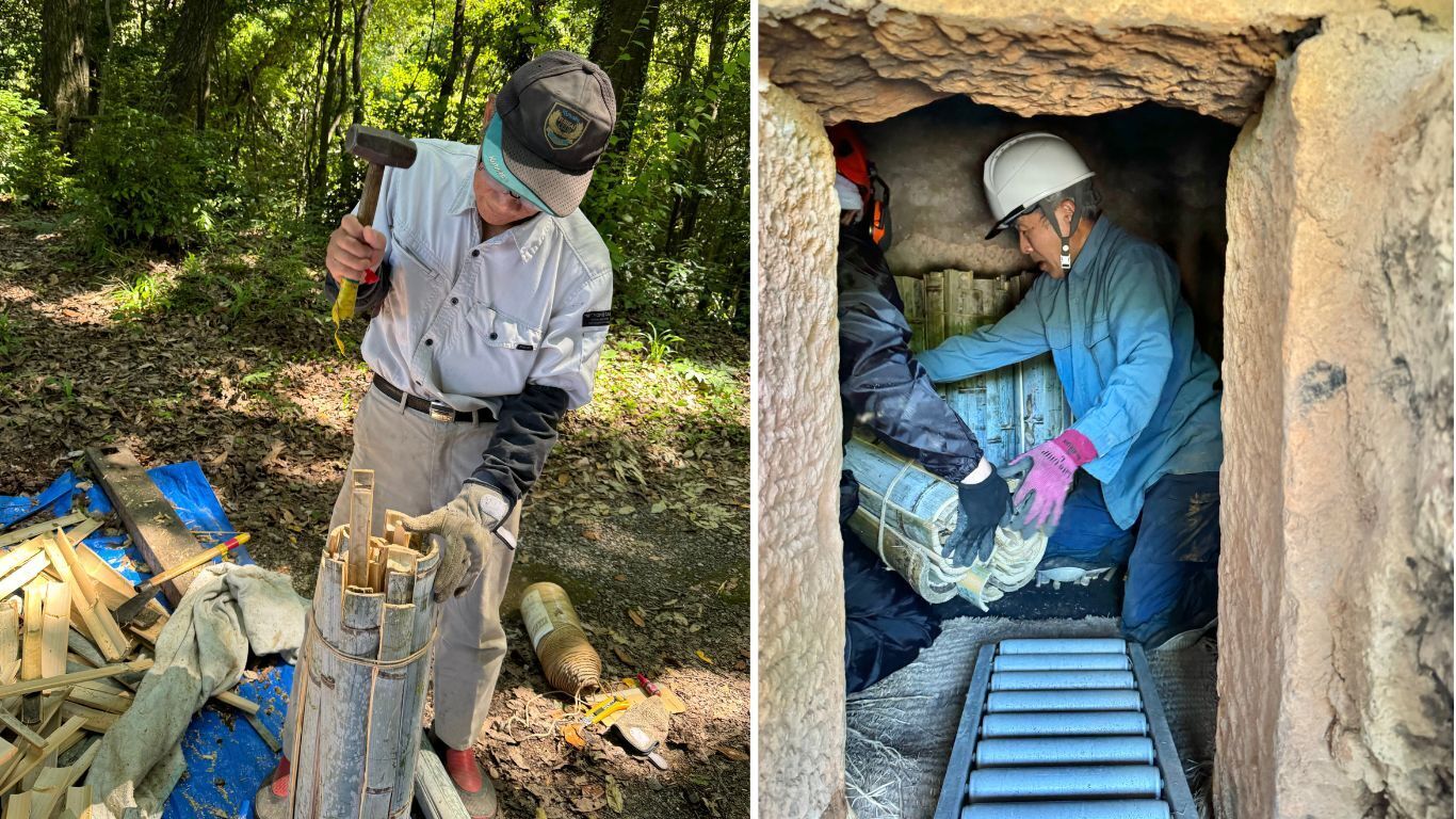 細く割った竹をまとめて麻ひもで結び、土窯へ。昔ながらの土窯で高品質の竹炭を造ります