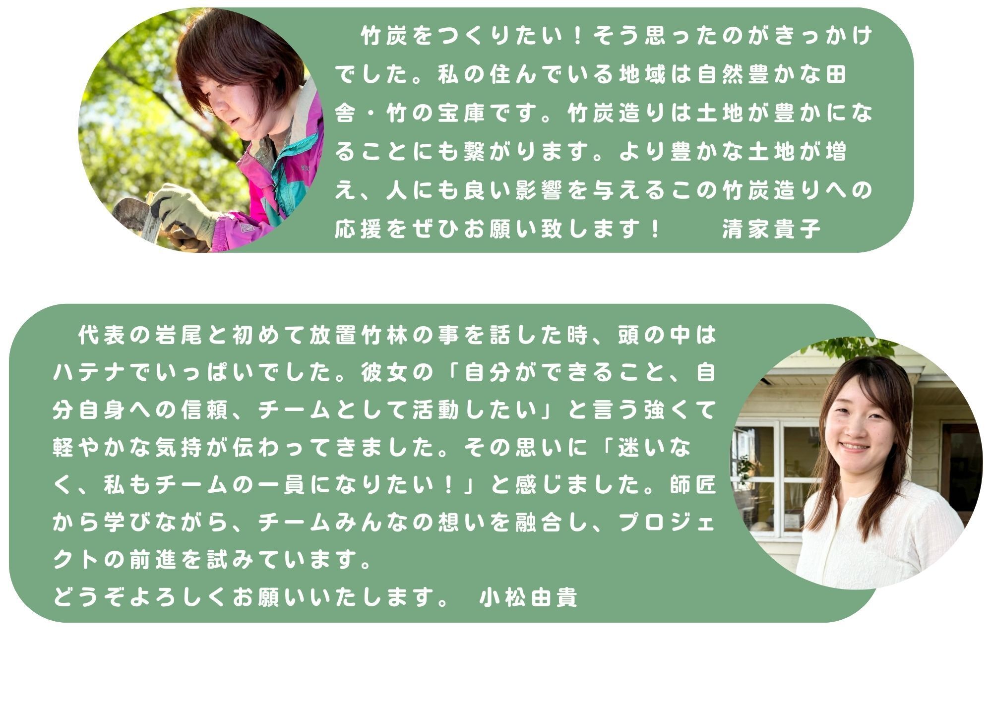 地域が抱える竹林問題に取り組み、竹炭を製造し、皆さんに愛していただける商品の開発・販売を目指します。自然と共存できる地域活性化を具現化することで、地元の雇用創出にもつながると考えています。竹炭という自然素材で、地域も人の体も“ちょう”元気に。持続可能なビジネスの構築を目標に掲げ、厄介者とされている竹を、再び日本の宝へ。皆さまのご支援・ご協力をよろしくお願いします。