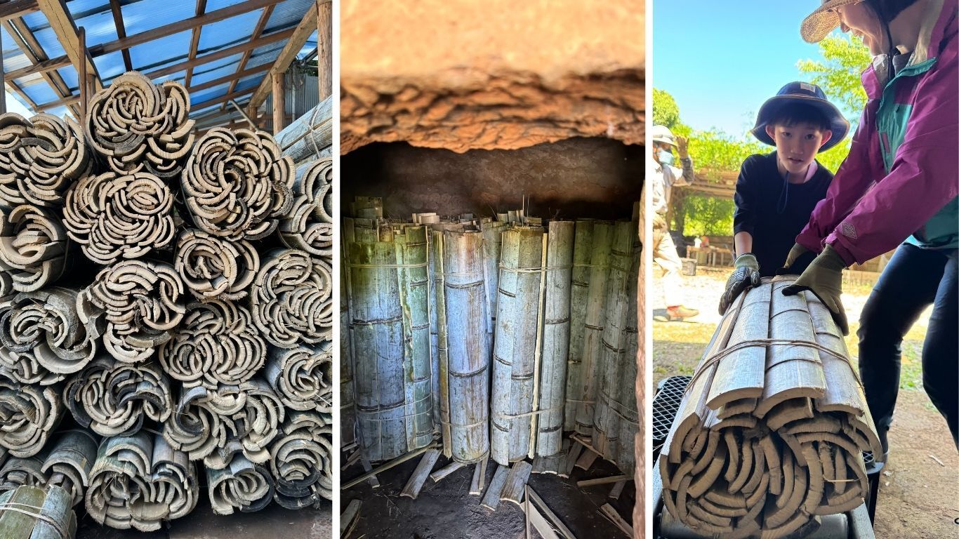 細く割った竹をまとめて麻ひもで結び、土窯へ。昔ながらの土窯で高品質の竹炭を造ります