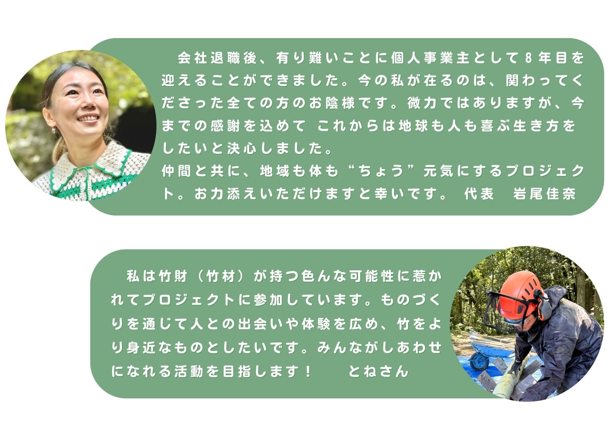 地域が抱える竹林問題に取り組み、竹炭を製造し、皆さんに愛していただける商品の開発・販売を目指します。自然と共存できる地域活性化を具現化することで、地元の雇用創出にもつながると考えています。竹炭という自然素材で、地域も人の体も“ちょう”元気に。持続可能なビジネスの構築を目標に掲げ、厄介者とされている竹を、再び日本の宝へ。皆さまのご支援・ご協力をよろしくお願いします。
