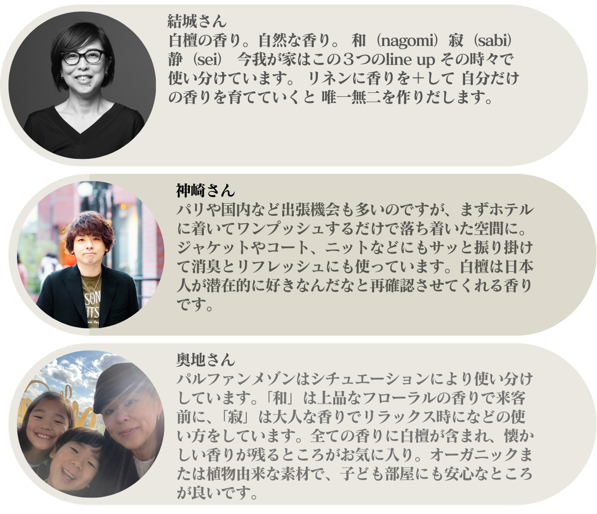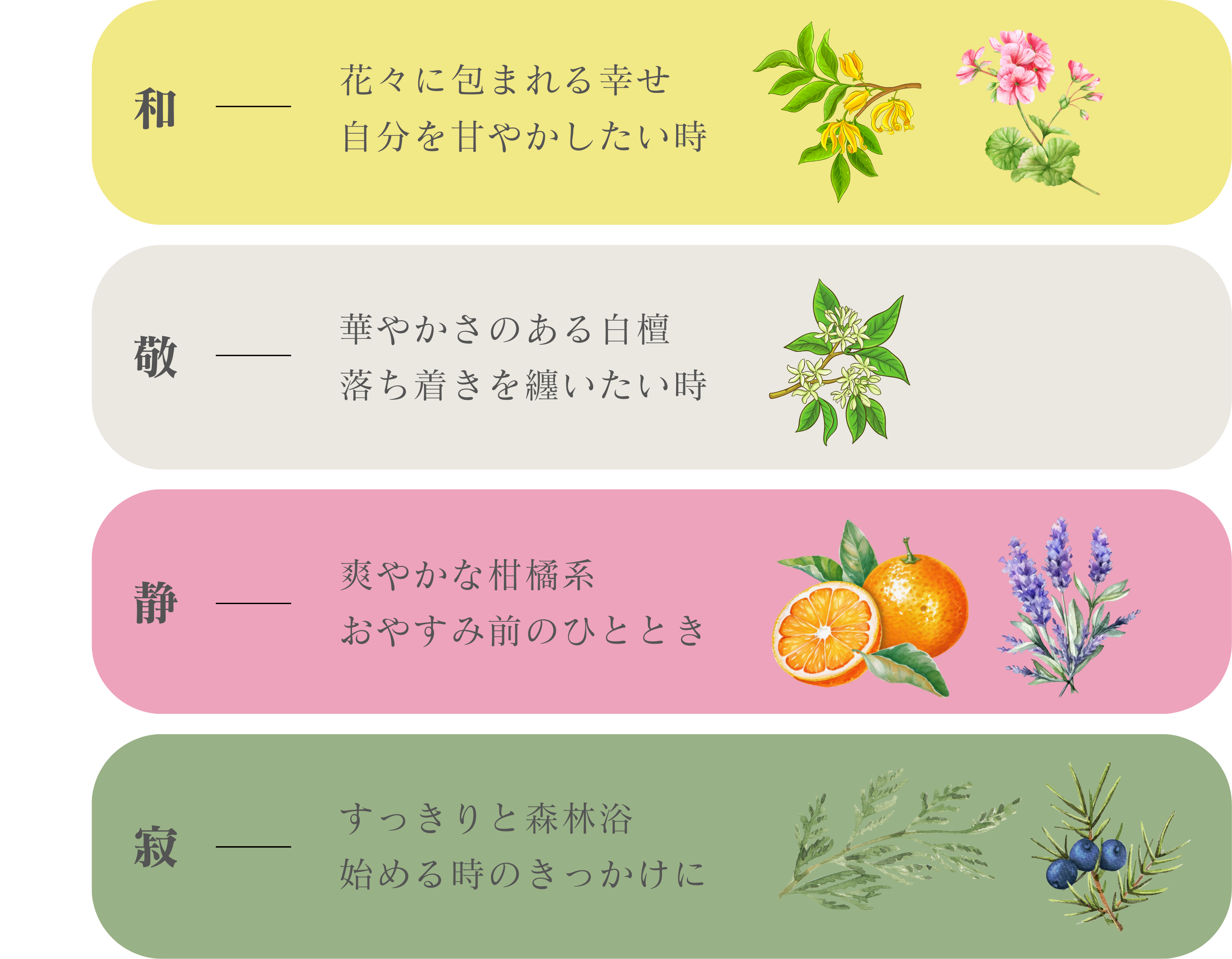 - 香りはその時の気持ちや気分、そしてその後の時間の過ごし方をも変えてくれる、どこか不思議な力があるように私は感じることがあります。その香りを、より深く五感のすべてを使って感じることができればなおさら楽しいなと。