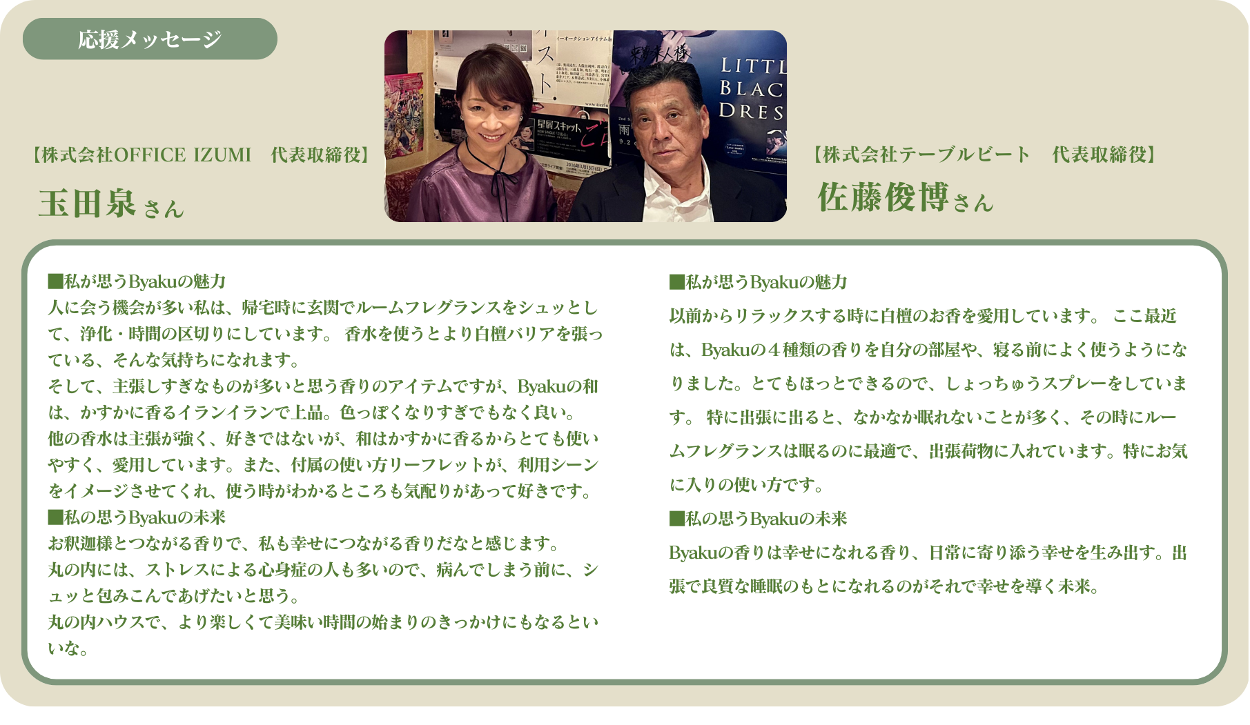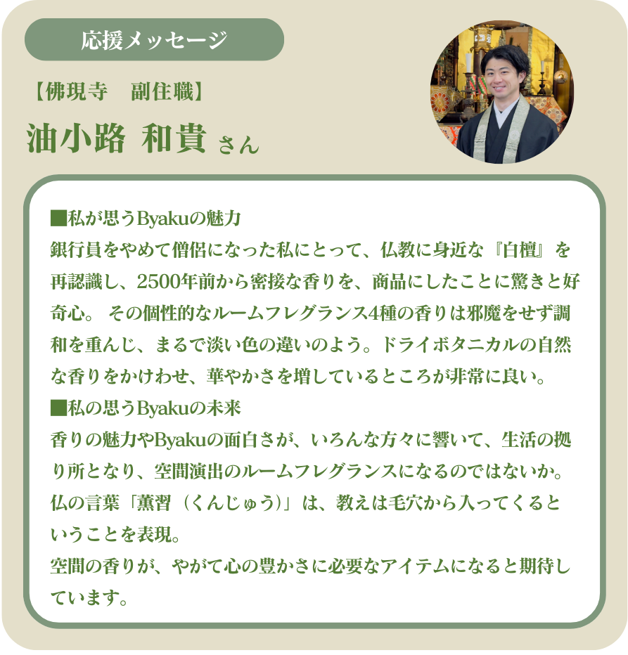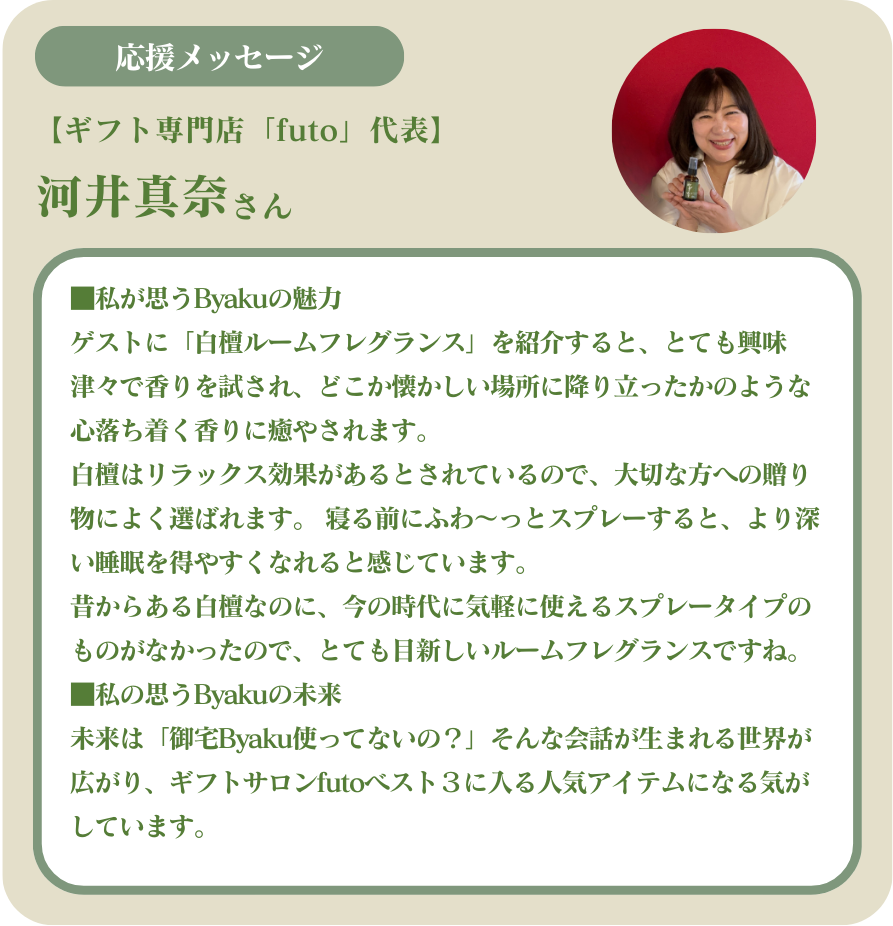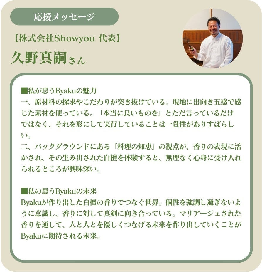 Byakuは皆様に支えられて今年で4年目。サンダルウッドとも言われる「白檀」に特化し、ルームフレグランスを中心とした京都発の香りの会社です。