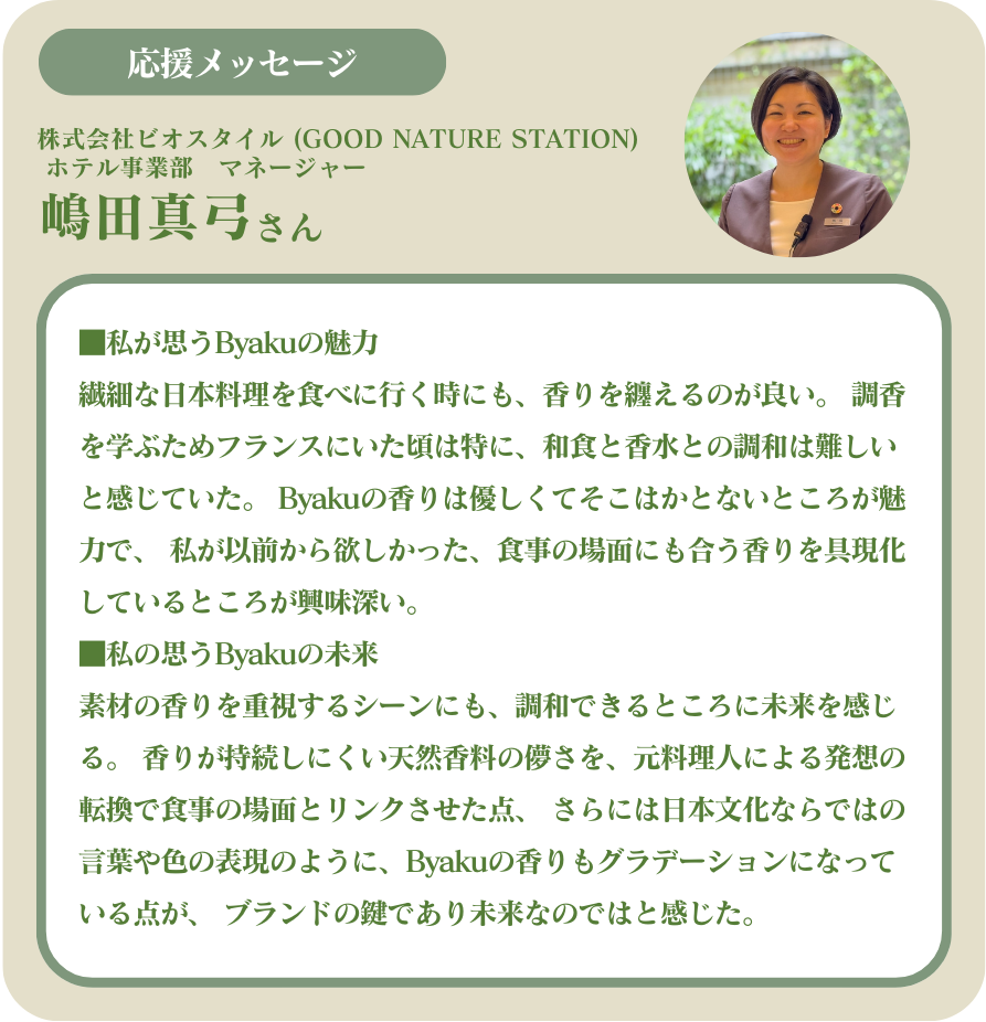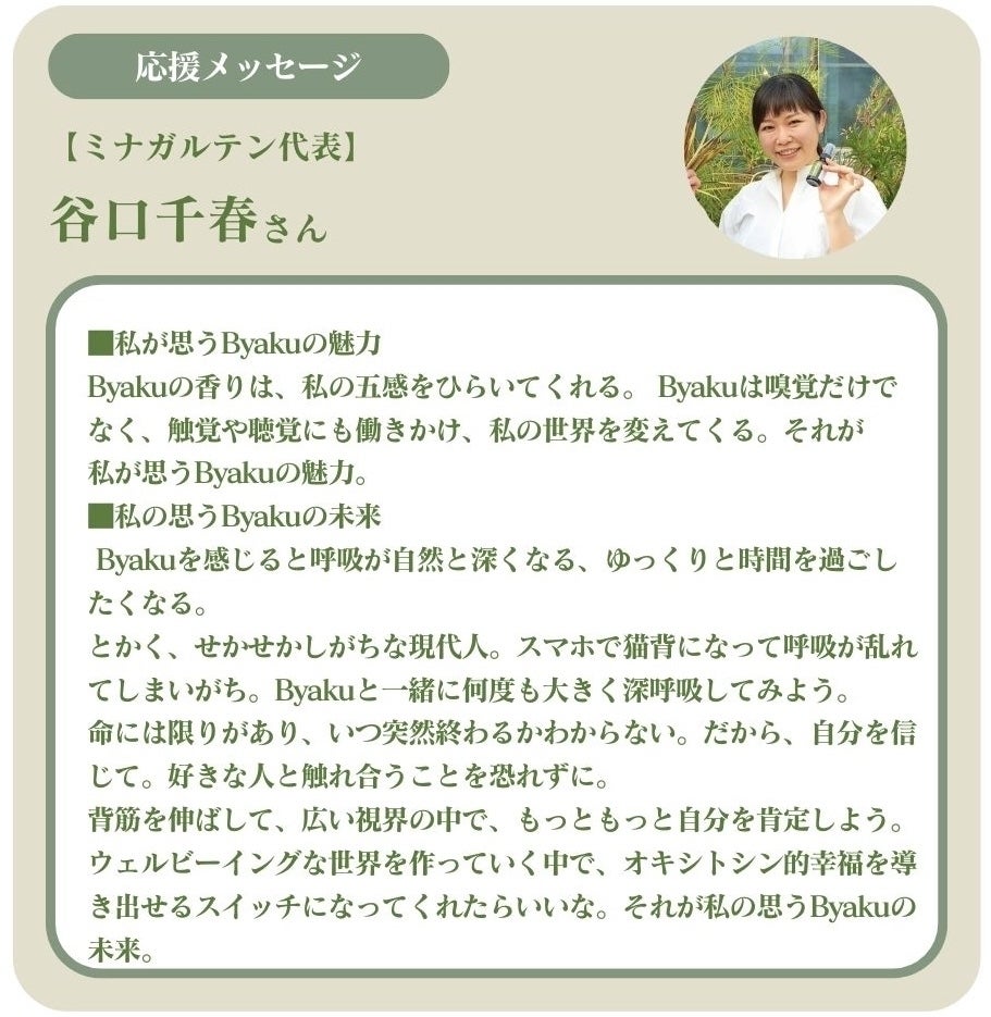 この私が好きな「白檀」の香りを多くの方々に知っていただき、「白檀」と触れ合う場所を確保することで、「白檀」の香りを手に取り感じることができる幸せをこれからも未来永劫伝えることができ、「白檀」が育つ森をしっかりと守ること、これがByakuの使命だと感じています。