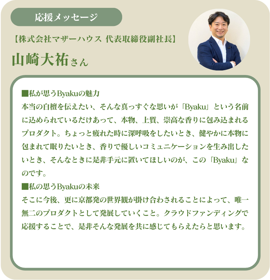 自然由来にこだわる「Byakuの白檀」を、引き続き、多くの皆様に楽しんでいただけるようするために、まだ、自前の店舗を持たないByakuの魅力を伝える「間借りワークショップの拠点」を構えることが必要だと考え、この拠点となる場所を、今後京都に店舗を持つための足がかりにしたいと強く願います。