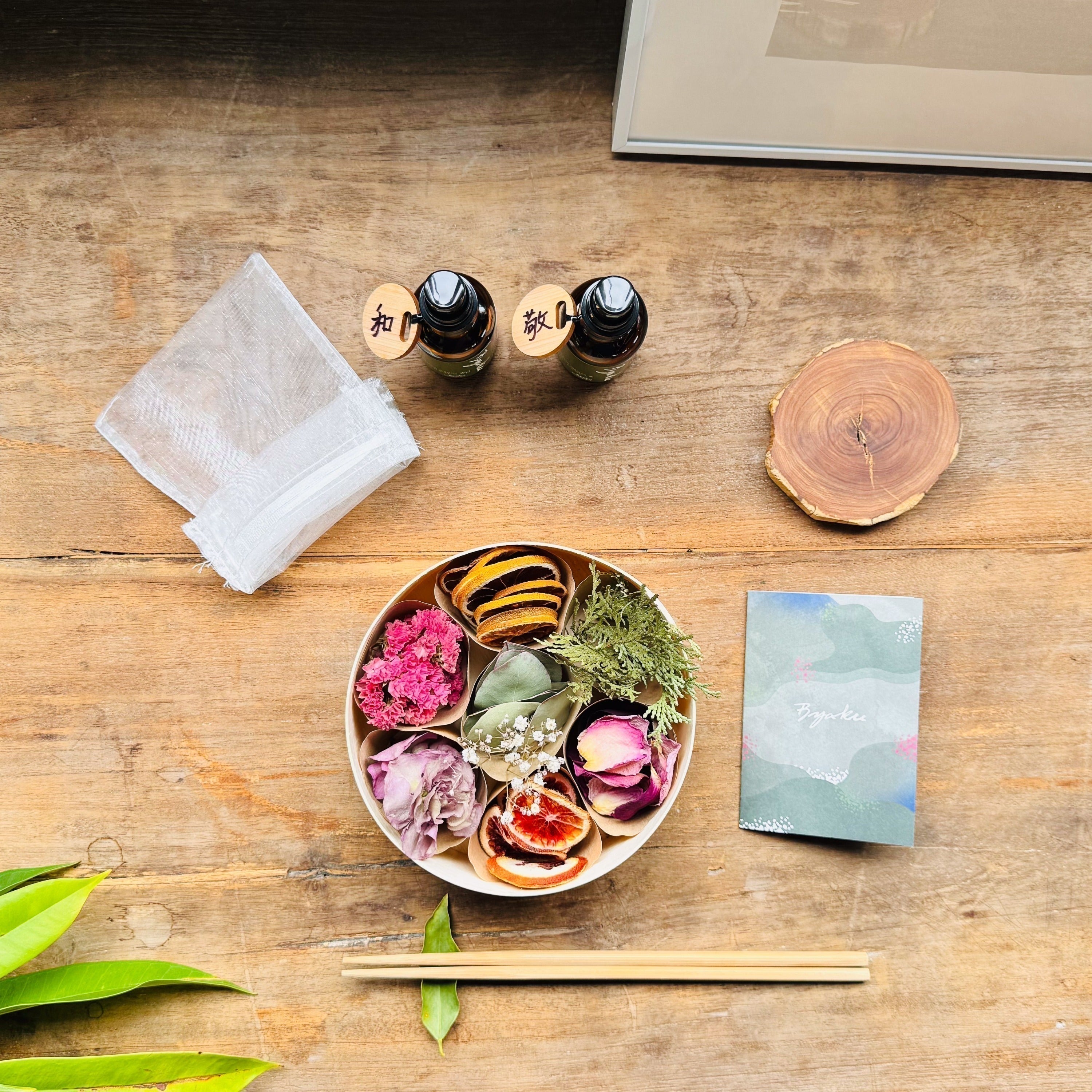 料理と同じで素材の組み合わせと調味料で、幾重にもバリエーションが生まれるように、このサシェも、ドライフルーツとドライフラワーにByakuのルームフレグランスをスプレーして香りを纏わせるだけではなく、時間を掛けてゆっくり香りを育てていく面白さがあります。
