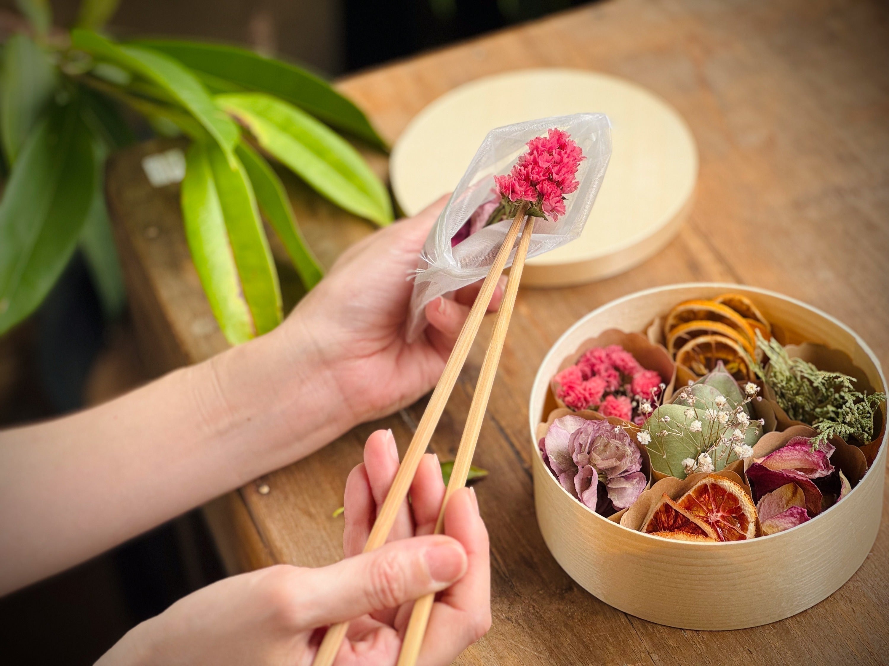 素材はドライトマトを作るプロセスをヒントに。花々の美しさと香りは祖母が教えてくれました。そのことを思い出しながらドライフラワー作りもしています。