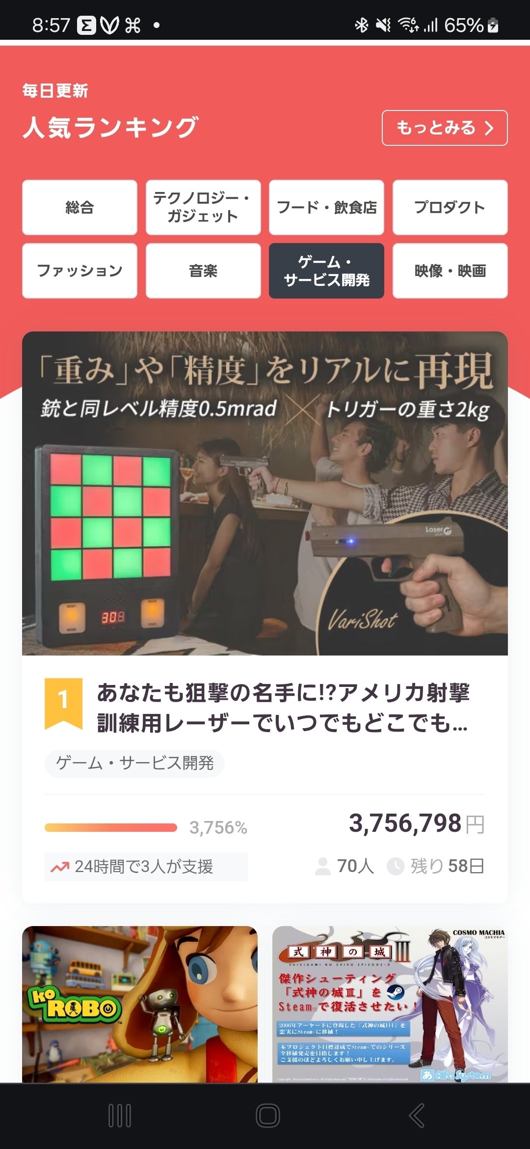 お世話になっております。KWSGstoreです。8/3現在、72名、約387万円以上のご支援をいただいております!なんと!キャンプファイヤーのゲーム・サービス開発での人気ランキング1位を頂きました!!!ご支援いただいた皆さま、本当にありがとうございました!!!ご検討いただいている皆さま、数量限定ではありますが、VariShotを体験してみませんか?引き続きよろしくお願いします