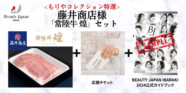 公式ガイドブックと応援チケット、茨城ご当地グルメ「藤井商店様 常陸牛 煌 セット」をお届けします。