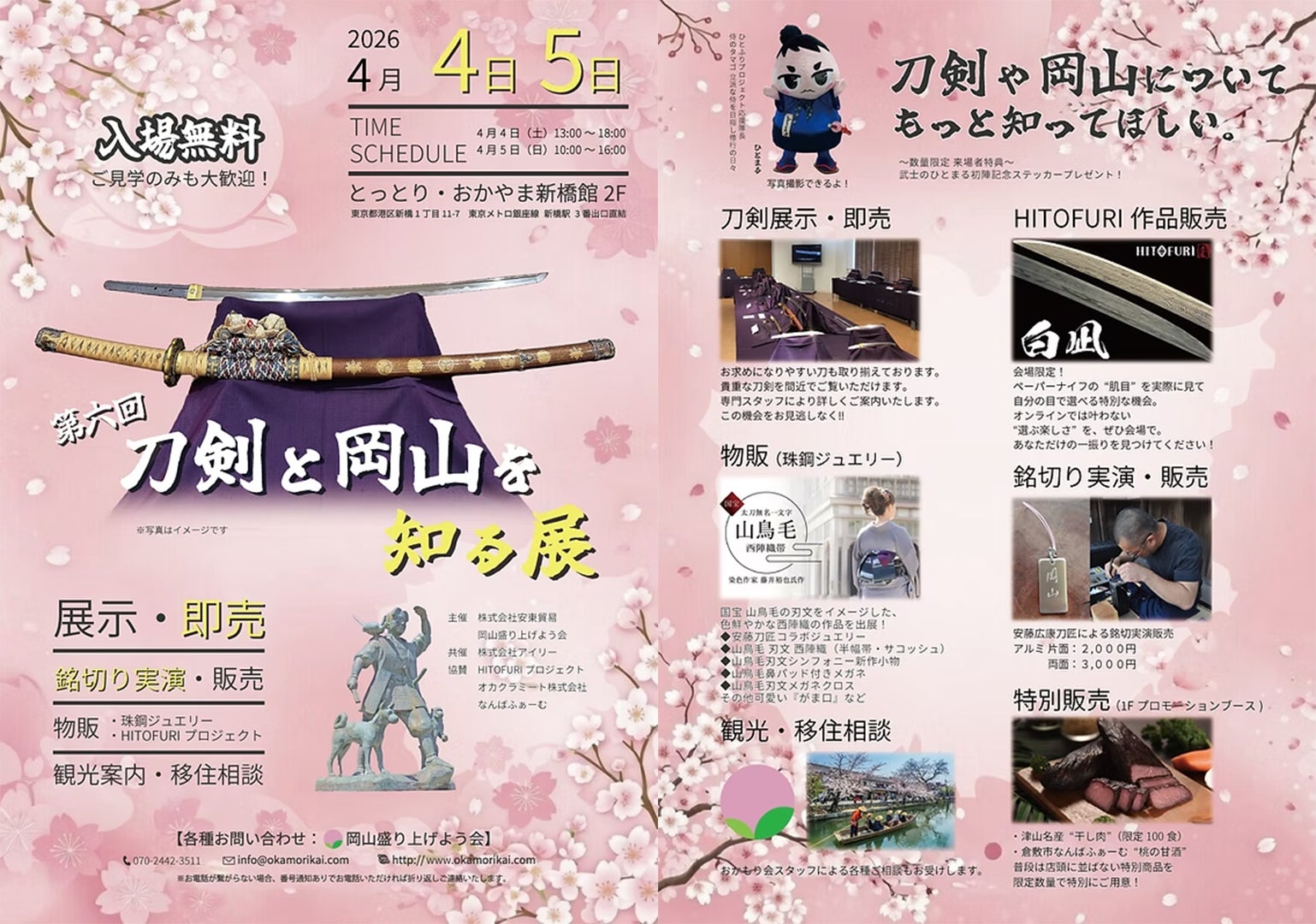2026/04/03 19:59明日4月4日(土)・5日(日)の2日間、新橋「第6回刀剣と岡山を知る展」にて、HITOFURIのポップアップストアを開催いたします。今回のポップアップでは、普段はWEBでご覧いただいているHITOFURIの作品を、実際に目の前でご覧いただけます。特に今回は、刀剣型ひとふりを実際に見比べながら、自分だけの一振を仕立てていく体験をご用意しました。また、現在CAMPFIREで開催中の御守型ひとふりも実物をご覧いただけます。さらに会場では、日本刀の展示即売も行われており、普段はガラス越しに見ることの多い日本刀を、間近で感じていただける貴重な機会となっております。スタッフにお声がけいただければ、実際に重みを確かめていただける場面もございます。そして今回は、大きくなったひとまるが新橋に登場します!ご来場くださった方には、ひとまる初陣記念ステッカーもご用意しております。お近くの方はぜひ、“画面の中ではなく、目の前で出会うHITOFURI” を体験しにいらしてください。開催日時4月4日(土) 13:00〜18:004月5日(日) 10:00〜16:00会場とっとり・おかやま新橋館 2F「第6回刀剣と岡山を知る展」・東京メトロ銀座線「新橋」駅(3番出口 ※ビル直結)徒歩すぐ ・JR「新橋」駅(銀座口) 徒歩約1分ご来場が難しい方も、現在開催中のCAMPFIREプロジェクトをぜひご覧ください。https://camp-fire.jp/projects/929954/view もっと見る【御守型ひとふりをご支援いただいた皆さまへ】