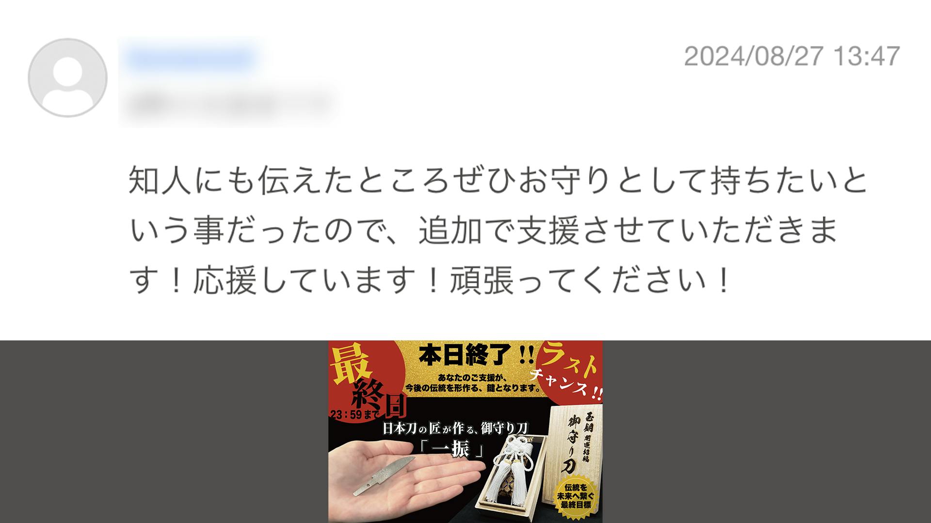 この度は、お知り合いの方にも「御守型ひとふり」をお勧めいただけたことに、心より感謝申し上げます。