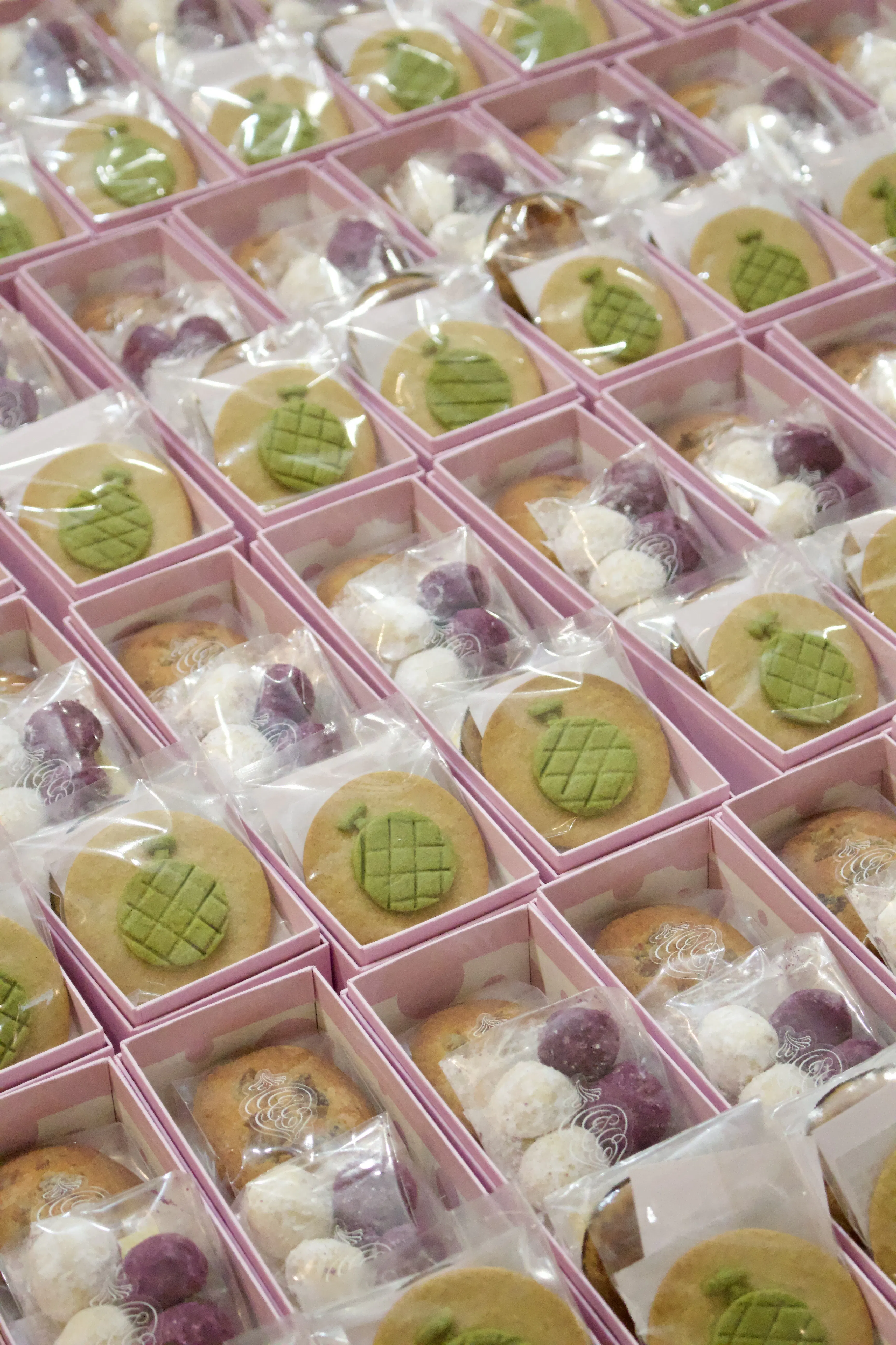 今回お作りした引き出物の焼き菓子セットは、和栗のマロングラッセをのせて焼き上げたこの時期限定のフィナンシェ、ゲランドの塩がきいたガレットブルトンヌ、紫芋とプレーンの紅白のスノーボールクッキーなどカシミヤ定番の焼き菓子にオリジナルクッキーをプラスしました。