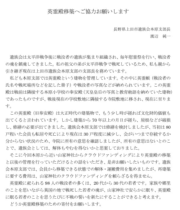 2024/10/03 12:54本当にありがとうございます!!このプロジェクト終了日である8月31日。一つの歴史と人の想いが明日へとつながった…時がつながった維時の瞬間をひしひしと感じました。そして本当にごめんなさい!!これから御礼の作業にとりかかります。必ず感謝をお届けしますので待っていてください。ほんっといつもみなさまの優しさに甘えていてすみません。前からお話していますが、やったことのない事や、はじめての事に挑戦するのって、本当に風当りが強いんです。ホコリが飛んで来て「わっ」て目をつぶって立ち止まることを余儀なくされる時もあれば、小石や枝が飛んで来て「いやっこれは痛いぃぃ」と悶絶する時もあります。この強風にはですね、やっぱり一人では進んでいけないと思います。メンタル土筆の宮司視点では凄惨極まる状況でした。同じ神主さんからもなんか飛んできたりするので、まぁこれは誰に言ったってわかってもらえないんだなぁって思っていたんです…が!!こうして陰日向に応援してくれる方が支えてくれていて、あきらめずに今日もまた前に進むことができているんだ…と知りました(宮司の中でも過去最大級につらい案件だったようです)。この表現しか見つからなくてもどかしさもあるのですが、ありがとうございます!!支えてもらいました、引っ張ってもらいました、励ましてもらいました。今日もプロジェクトである造成工事が行われています。現在平和の塔が3分の1ほど解体されています。山家神社境内にある平和の塔は、石の剥離が著しく地震をはじめ冬季の凍みあがりにはもう耐えられないくらい、限界が来ていました。昭和の後期につくられた近代的な形の建造物であり、そこには「平和の塔建造の経緯」と「真田町長地域の戦争で亡くなられた方のお名前」が刻まれた石板が埋め込まれていました。もう危ない、なにかあったらどうする?と見積をとりましたが、大変大きな金額でとても神社と遺族会でまかなえるものではありませんでした。解体するには申し訳なさが残り、とても手がつけられないジレンマに陥っていました。それが今回プロジェクトである本原地区の英霊殿を引き取ると決めた瞬間から、この苦悩から解放された気がします。これは当初英霊殿の解体を決断した本原地区遺族会と同じ気持ちなのかもしれません。自分たちの手で無に帰してしまうのは忍びない、申し訳ない。おそらくきっと、ずっと事あるごとにそう思いながら生きていくことになっていたかもしれません。その道しかなかったにしても、心にはきっとしこりが残ります。だけど、突如として形は変われど想いがつながる…そんな新しい形、未来につなぐ形にできる道が開けたんです。幸か不幸か、そのきっかけをつくったのは、今回の本原地区の英霊殿(旧奉安殿)解体でありました。私のところに話が舞い込んできたのも、なにかの縁、他生の縁であったのかもしれません。そう考えて、みなさまの他にも、神社の神さま、そしてご先祖さまたちにも支えてもらっている事業であると、心より感謝申し上げます。さきほどの平和の塔、当時の人たちは未来に何を残したかったのでしょうか?その形?威容?それもあったかもしれませんが、その本質は「平和への祈り」「こんな悲しい苦しい同じことはもう起こさないで」「未来は明るくあって欲しい」「忘れないで」と私は感じています。その想いを埋め込んだ石板は新しい形で、これから移築再建へと動いていく英霊殿(新名称:真田照今殿)に玉垣風に安置する形で伝えていきます。このプロジェクトの他にも、翌日よりすぐ真田の仕掛けと御柱祭という大きなプロジェクトが開始され、その反動から、気力が戻らずになかなか身動きとれない日々が続いておりました。が、今日立ち直りました!!実は神主さんの中でも共感して支えて励ましてくれる仲間が4人もいたんです。昨日なんだか元気もらいまして、今日ようやく動かざること山のごとしから方向転換することとなりました。今まで腐っててほんとごめんなさい!!今日から少しでも前へ進んでいきます!!写真は暗い中に灯りを照らしていきたい…そんな想いでつくったぼんぼりです。アスヲテラス、そんな今でありますように。 もっと見る