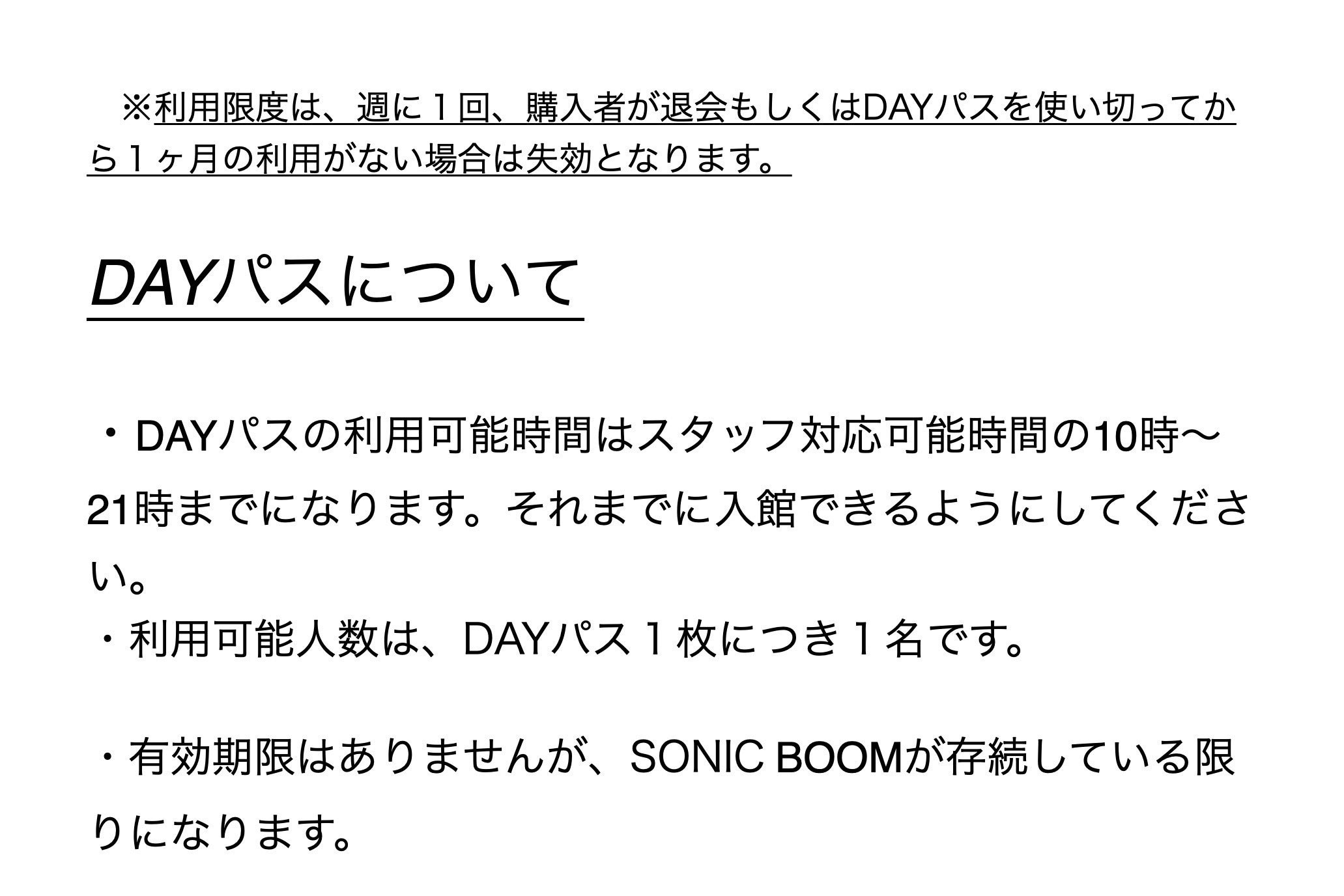 ・DAYパスの利用可能時間はスタッフ対応可能時間の10時~21時までになります。それまでに入館できるようにしてください。