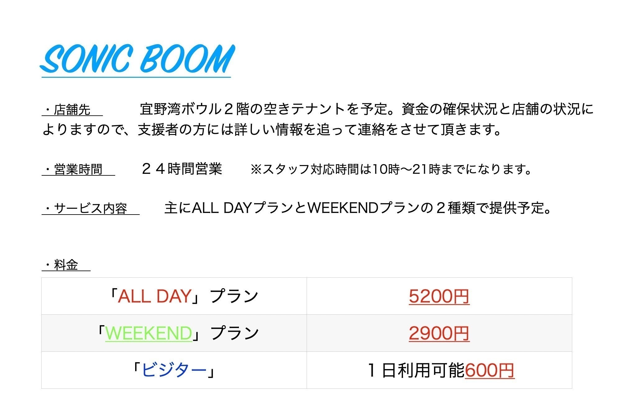 ・サービス内容 主に「ALL DAYプラン」と「WEEKENDプラン」の2種類で提供予定。