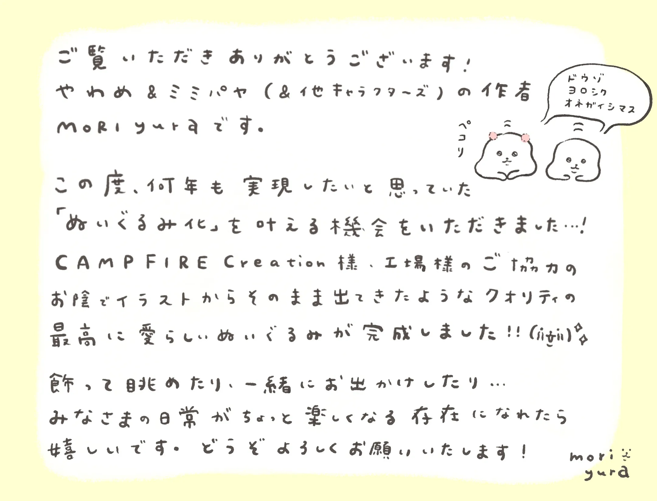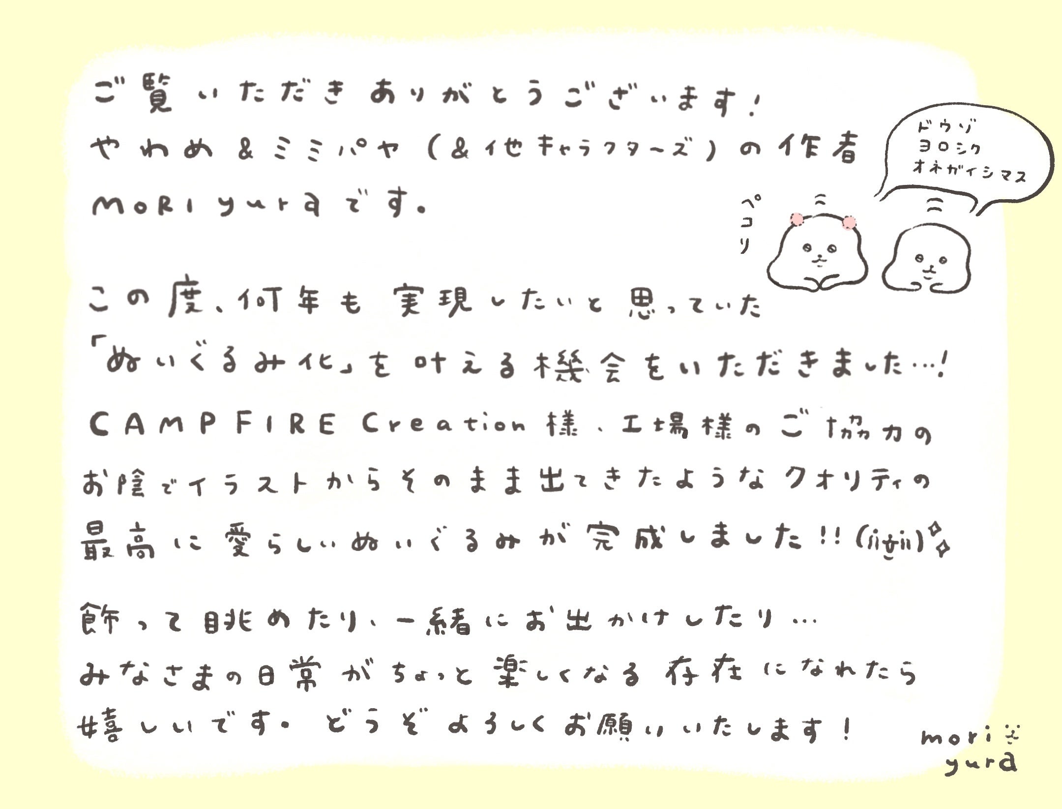MORI yuraが描く「やわめ」と「ミミパヤ」がぬいぐるみ化に挑戦します!