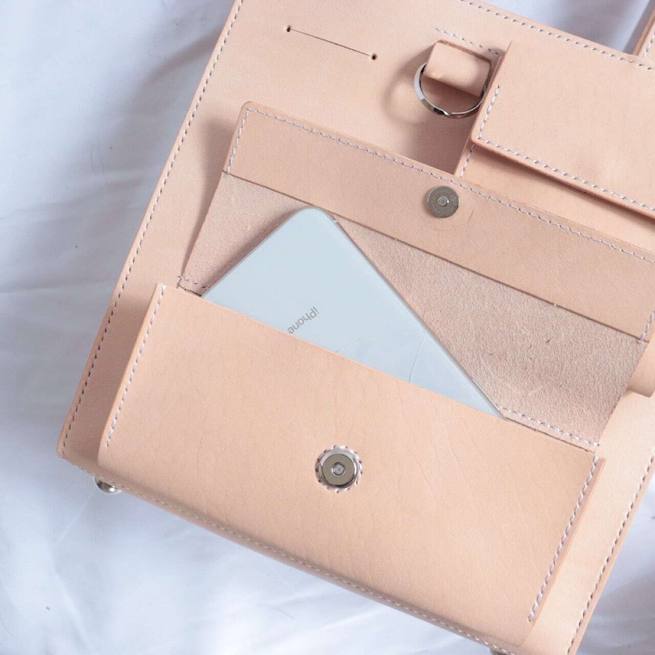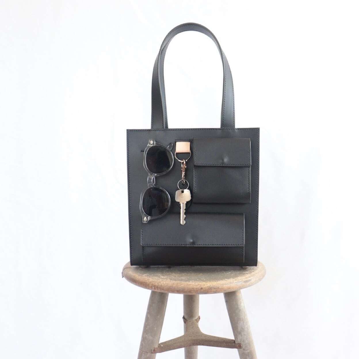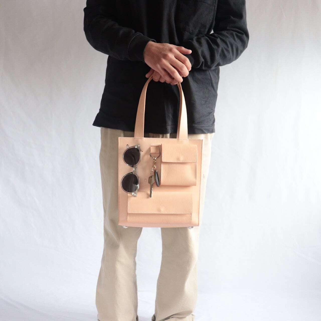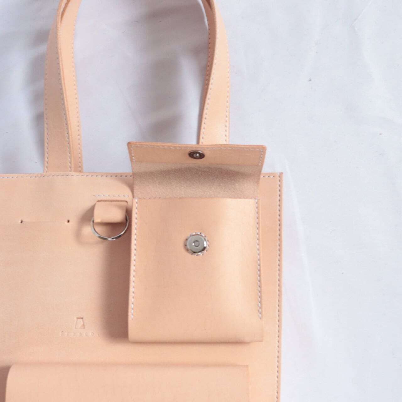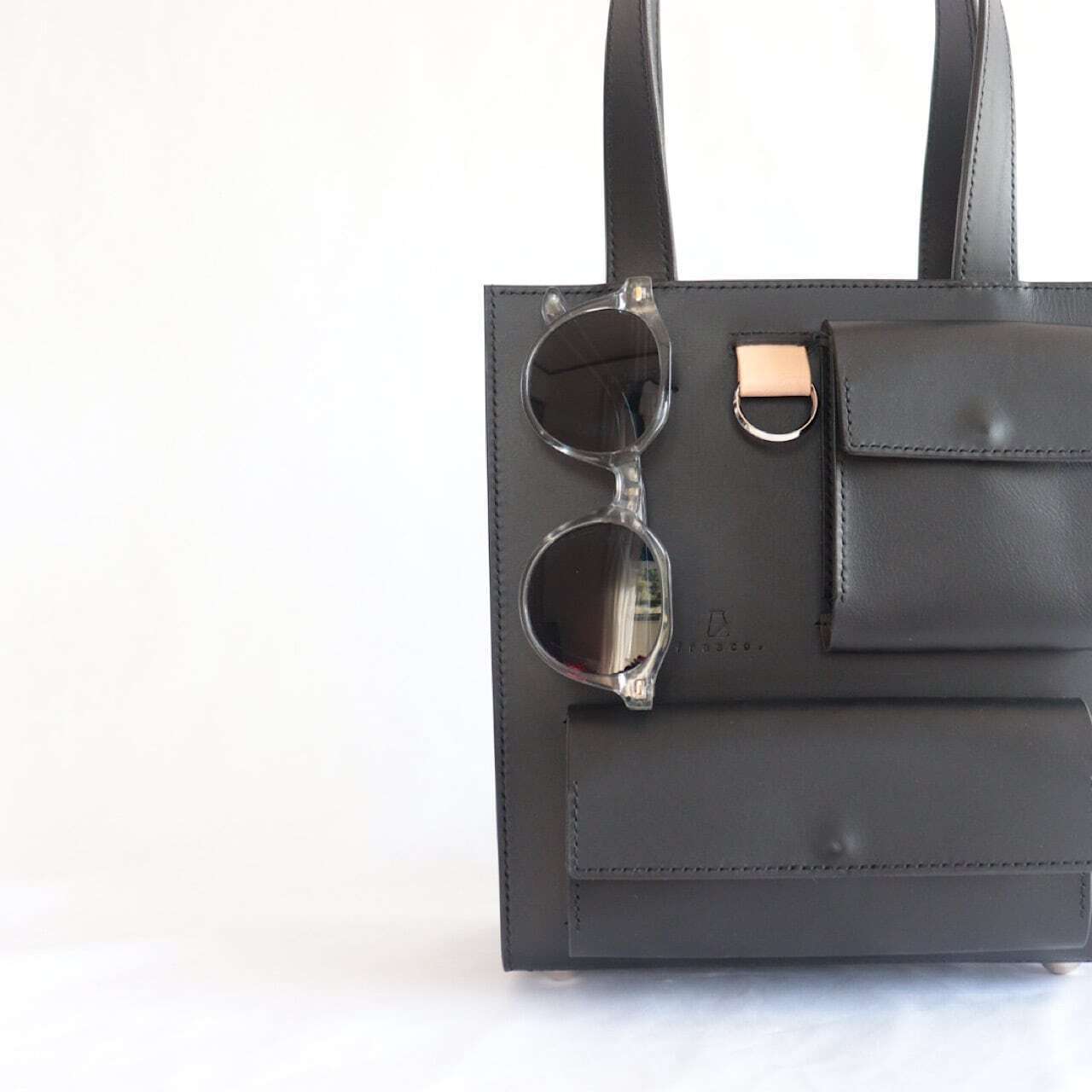 香水やカードケースなどの小物を収納できるミニポケットが2つ、さらにメガネやサングラス、ペンなどをかけることができるスペース、キーリングなどたくさんのスペースをご用意いたしました。