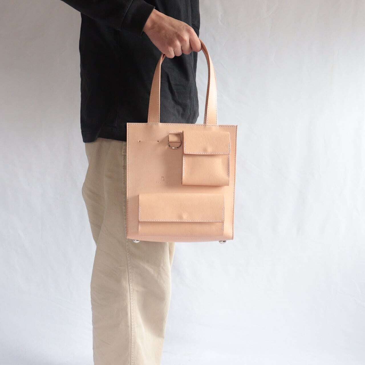 長すぎず短すぎない長さの持ち手は手持ち、肩掛けどちらでもご利用可能でシーンに合わせて持ち方を変えていただけます。
